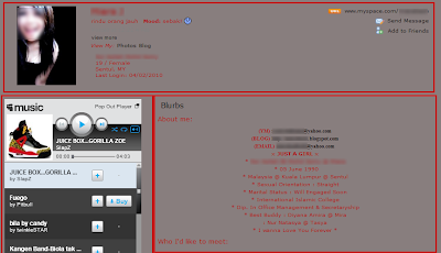tarikh lahir, no telefon, dan sebagainya. ada pula segelintir yang suka mendedahkan gambar tubuh mereka yang kononnya mengiurkan untuk tatapan semua kaum adam. meskipun untuk hanya suka2 tetapi mereka tidak mengetahui betapa seriusnya apabila gambar yang sebegini tersebar di dunia internet kerana kemungkinan gambar mereka boleh dimanipulasikan oleh pihak2 yang tertentu khususnya kepada yang pakar dalam mengedit gambar. Dalam mencari maklumat peribadi pada enjin carian seperti google atau yahoo, cara yang paling senang untuk mencari ialah dengan memasukkan email si mangsa dalam kotak carian. Dengan cara begini segala maklumat dapat dicari serta merta pada halaman2 web yang mungkin si mangsa mendaftarkan diri seperti di rangkaian sosial myspace, facebook, friendster dll. Berikut adalah beberapa contoh gambar yang mendedahkan maklumat peribadi mereka.