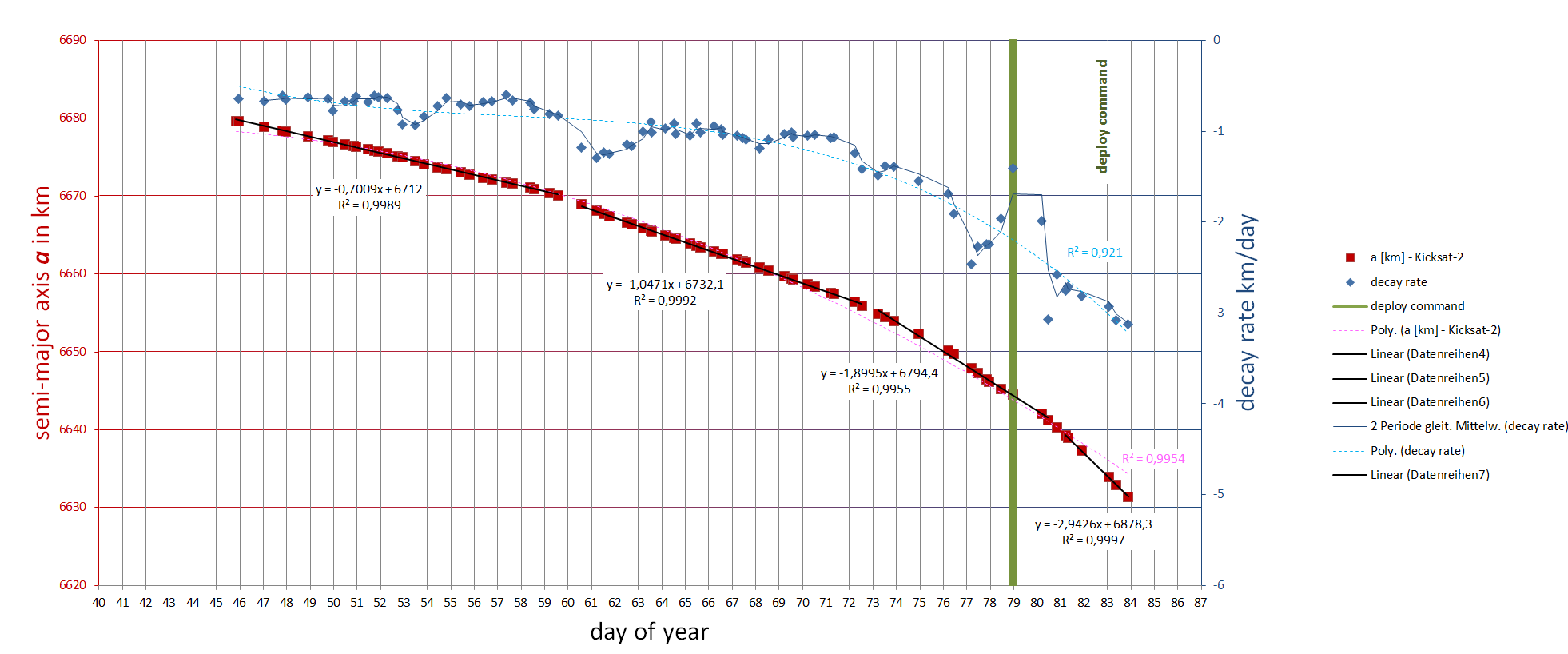 Hello all,Here are updated re-entry estimations for KickSat-2:SatEvo/SatAna: 2019 Apr. 2 @ 13h (+-3 days).GMAT: 2019 Apr. 2 @ 22h (+-3 days).As you can see I've adjusted some parameters in GMAT to match the new scenario after Sprites deployment. Now results are much closer to SatAna/SatEvo.