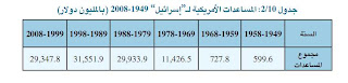 والأمريكان منذ ان قامت الدولة الصهيونية وهم يعاونون اليهود بكل ما يملكون من قوة من 1949 وإلى يومنا هذا بلا توقف (في الصورة جدول المساعدات الأمريكية للكيان الصهيوني من 1949 وحتى نهاية 2008 نقلا عن التقرير الاستراتيجي الفلسطيني 2008)