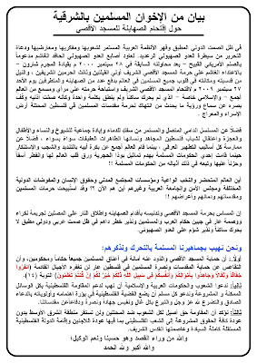 بيان الإخوان المسلمين بالشرقية حول ما حدث في فلسطين خلال الاسبوع الماضي بيان يستحق كاتبه التحية لأنه بيان تتناسب لغته وقوة لهجته مع قيمة الحدث أي أنه ببساطة : بيان على مستوى الحدث .