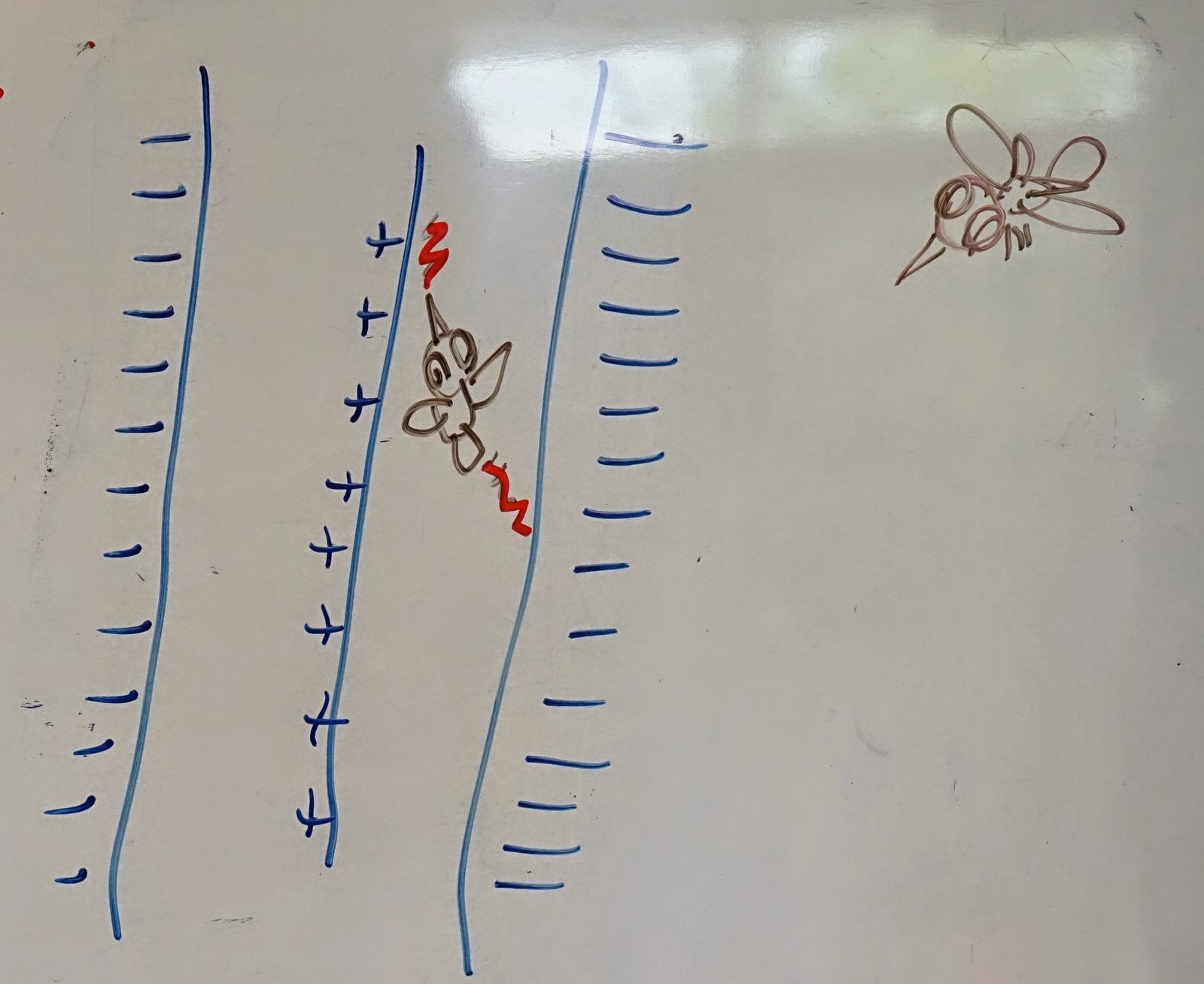 | ภาพวาดแสดงว่ายุงเข้าไปอยู่ระหว่างตะแกรงด้านใน (ใส่เครืองหมาย + เอาไว้) และตะแกรงด้านนอก (ใส่เครื่องหมายลบเอาไว้) |