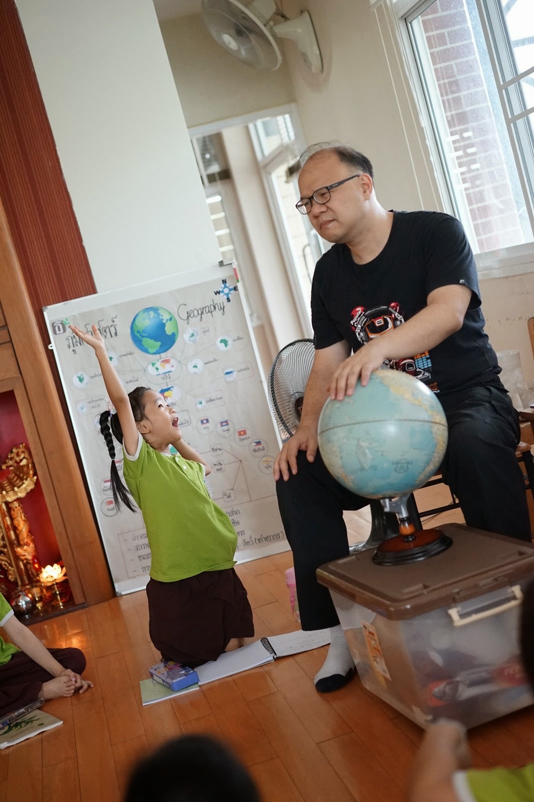 ต่อไปผมก็ถามเด็กๆว่าแล้วอากาศล่ะ มีเยอะแค่ไหน เด็กๆรู้ไหมว่ามองขึ้นไปบนฟ้าจะมีอากาศสูงขึ้นไปเท่าไร ผมให้เด็กๆลองเอามือมาทาบกับลูกโลกดูว่าชั้นบรรยากาศจะอยู่สูงไปสักเท่าไรจากผิวโลก