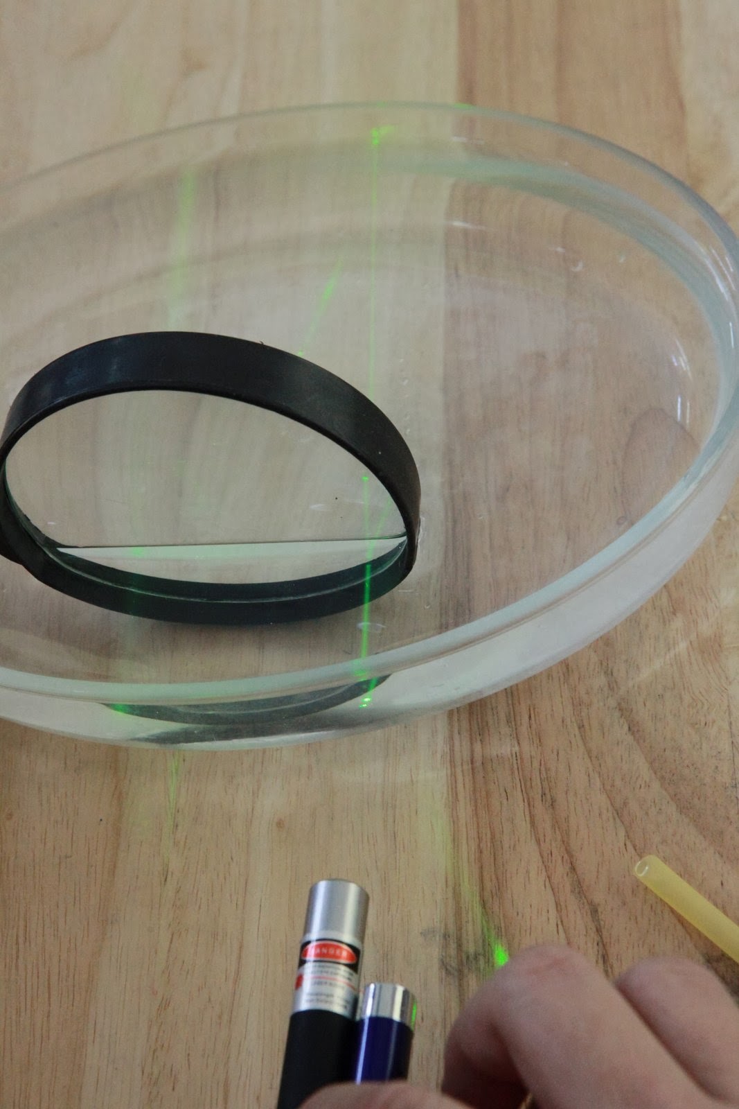 | ใส่น้ำในถาดแก้วแล้วหยดน้ำไปสักหยดสองหยดจะทำให้เราสังเกตทิศทางแสงได้ชัดขึ้นครับ |