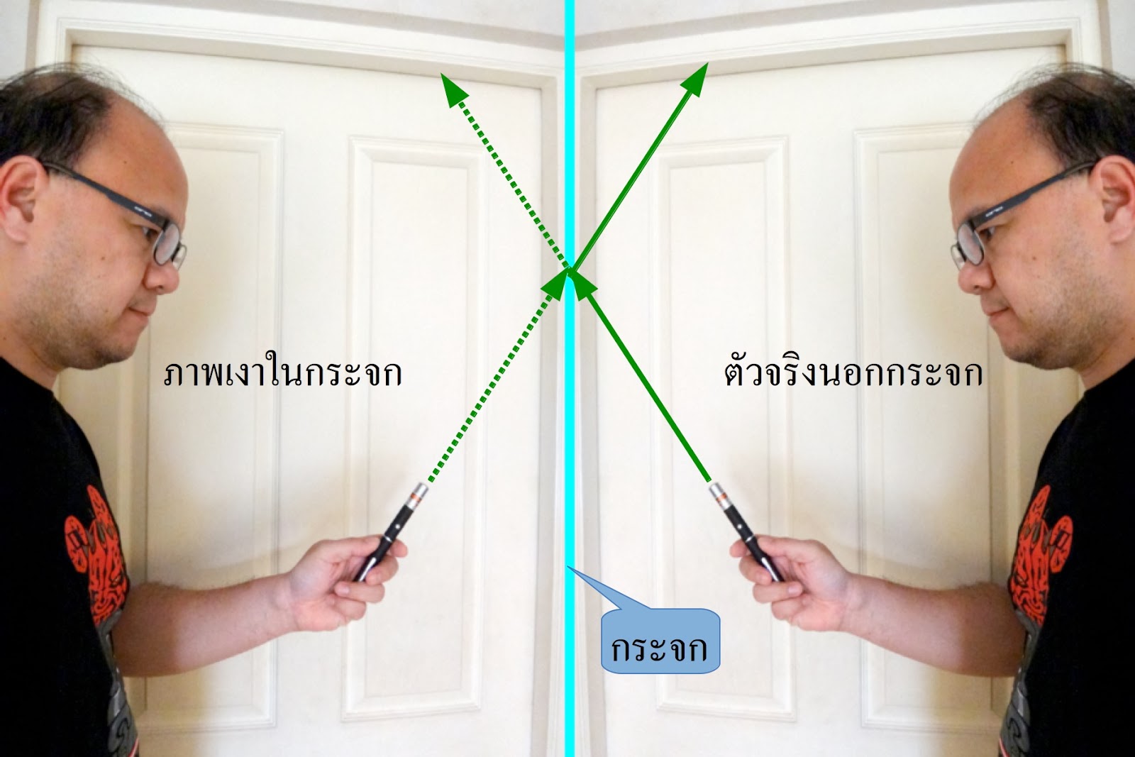 เด็กๆสังเกตได้ว่าเจ้าลำแสงเลเซอร์ที่สะท้อนออกมาจากกระจก มันเหมือนเป็นเส้นตรงเดียวกันกับภาพแสงเลเซอร์ในกระจกที่ภาพตัวผมในกระจกส่องออกมาเลยดังในรูปข้างล่างนี้ครับ: