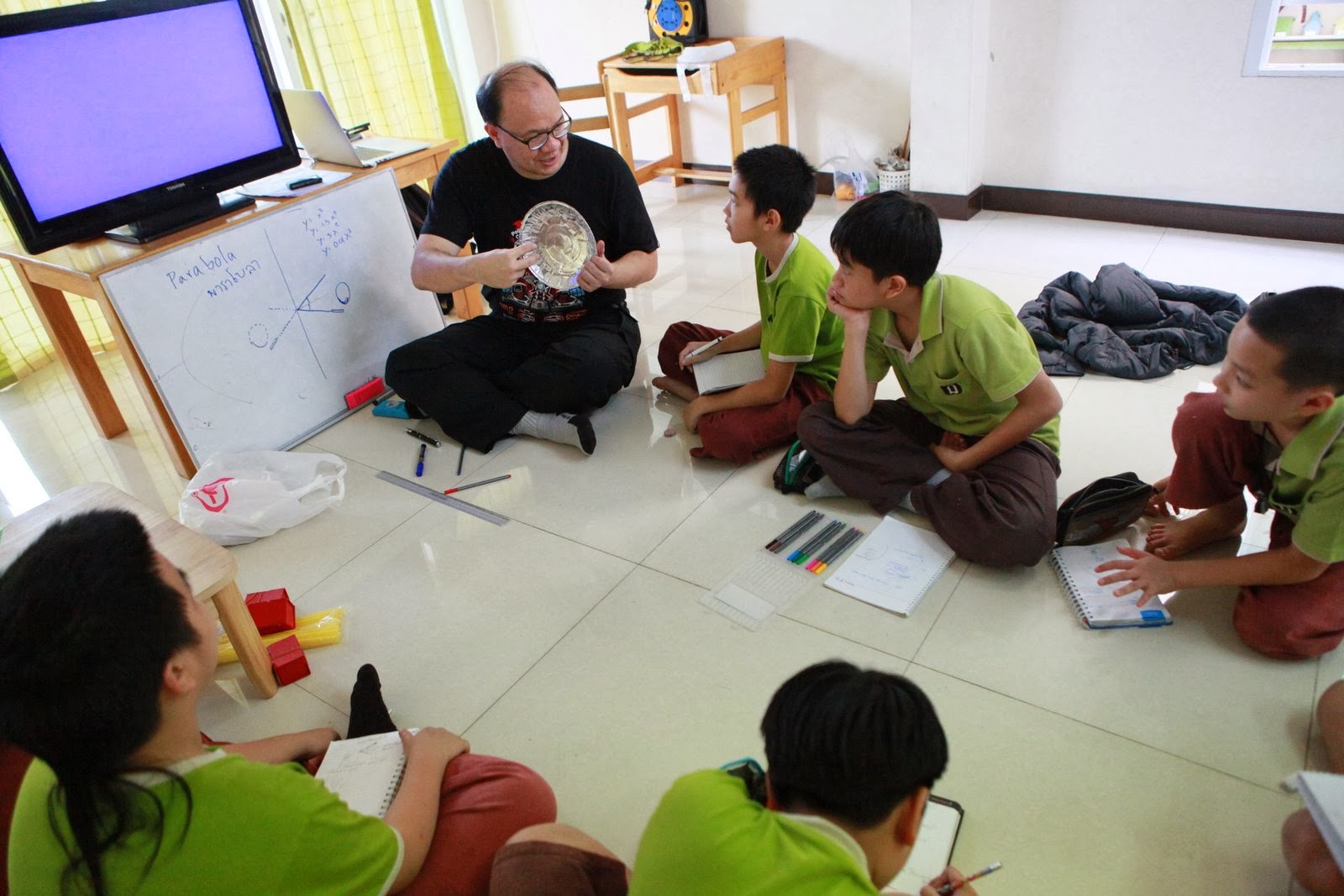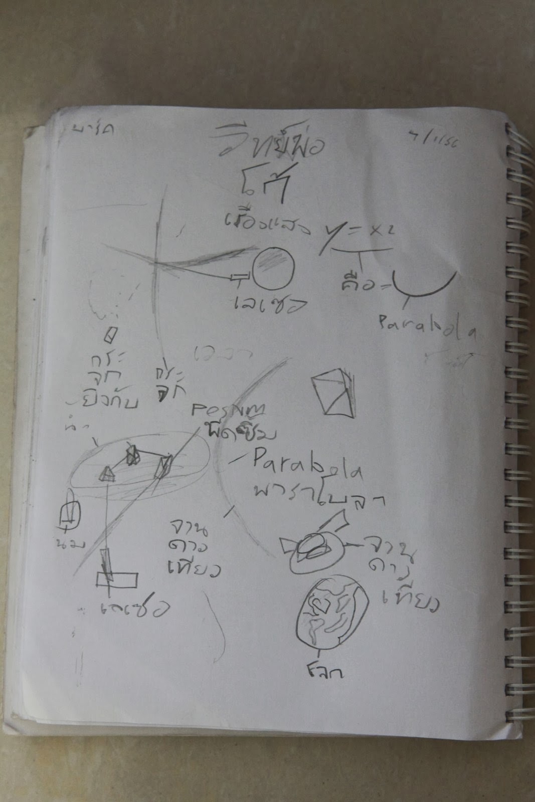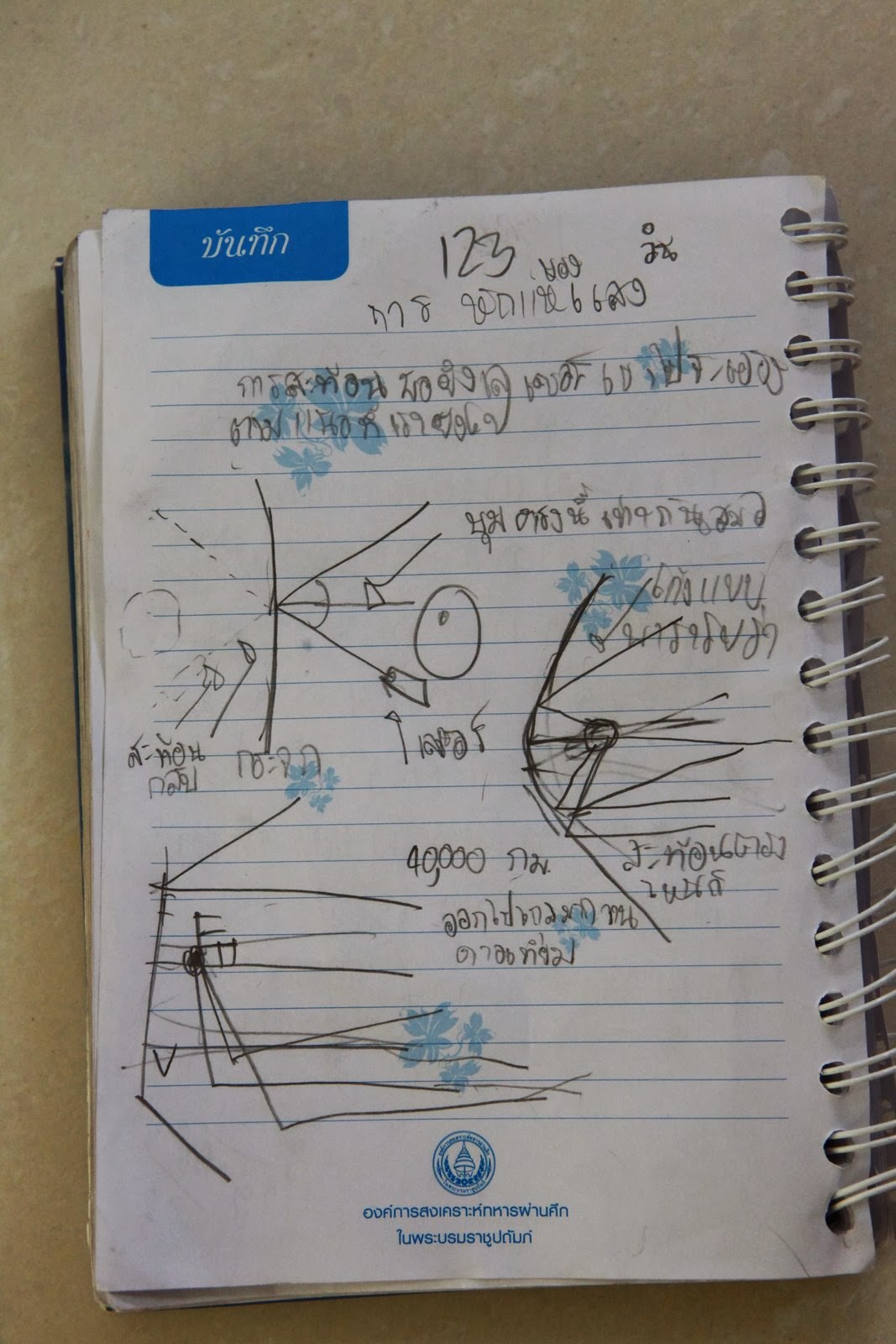 วันอังคารที่ผ่านมานี้ผมไปสอนเด็กๆกลุ่มบ้านเรียนปฐมธรรม กลุ่มบ้านเรียนเฟิร์น และอนุบาลบ้านพลอยภูมิครับ วันนี้เด็กประถมต้นได้ส่งการบ้านวาดรูปส่วนประกอบตา ดูวิดีโอจำลองการมองเห็นของสัตว์ต่างๆ (เหยี่ยว แมว หมา ผึ้ง หนู) ได้เห็นว่าภาพเกิดที่จอรับภาพด้านในหลังตาเกิดอย่างไร (เป็นภาพกลับหัว) โดยดูจากอุปกรณ์จำลองทำจากโคมกระดาษ แว่นขยาย และถุงก๊อบแก๊บ ได้เห็นภาพสิ่งประดิษฐ์ประมาณแปดสิบปีมาแล้วเพื่อช่วยฟังหาเครื่องบิน ส่วนเด็กประถมปลายได้ดูการสะท้อนแสงเลเซอร์ และได้เข้าใจว่ามุมการสะท้อนแสงมีความสัมพันธ์อย่างไร (มุมตก = มุมสะท้อน) ได้รู้จักจานสะท้อนแบบพาราโบลิค ได้รู้จักดาวเทียมแบบที่โคจรไปพร้อมๆกับโลกหมุน (Geosynchronous orbit) ได้เห็นการหักเหของแสงผ่านปริซึม และเมื่อแสงผ่านอากาศไปแก้วไปน้ำ ได้เห็นว่าแสงสีต่างๆกันหักเหไม่เท่ากัน ทำให้เราเห็นสีรุ้งได้ เด็กๆทั้งสองระดับชั้นได้ดูคลิปการยกและเคลื่อนย้ายสิ่งของเล็กๆด้วยคลื่นเสียงด้วยครับ