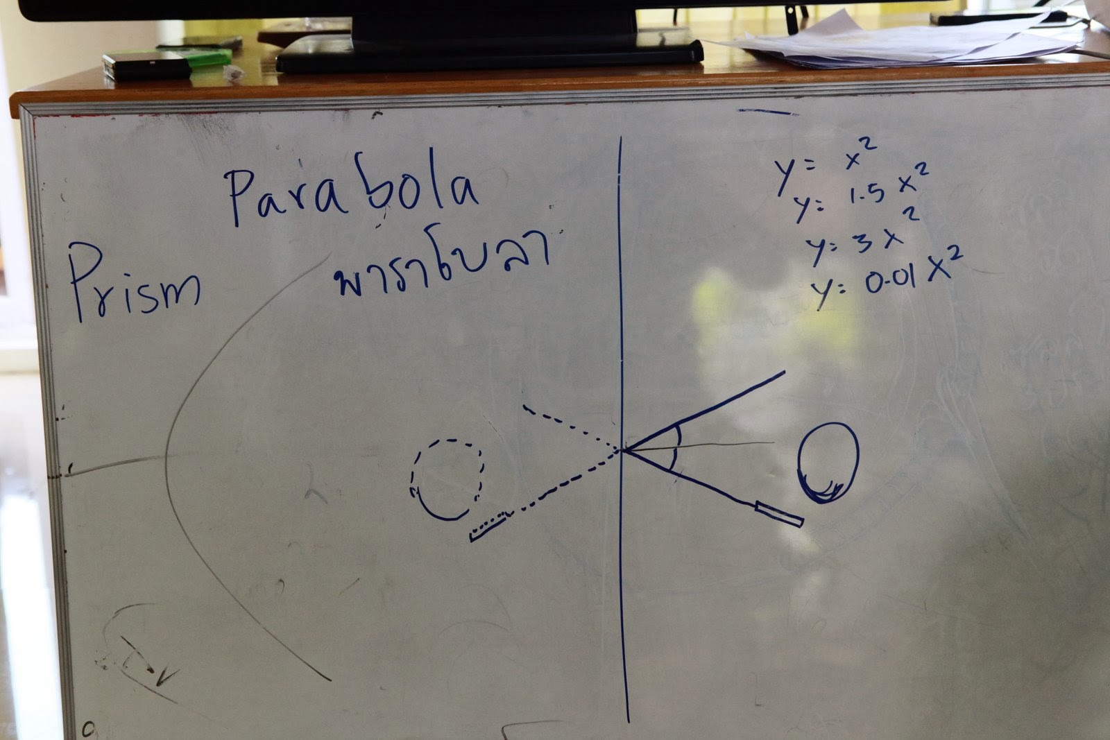 ต่อจากนั้นผมก็เอาถาดพายที่ทำจากแผ่นอลูมิเนียมบางๆให้เด็กๆดู ชี้ให้เด็กๆเห็นว่าถาดโค้งๆสะท้อนแสงเหมือนมีแผ่นกระจกเล็กๆที่เอียงไม่เท่ากันอยู่ติดๆกันเต็มไปหมด ดังนั้นเมื่อแสงวิ่งเข้าไปกระทบบริเวณต่างๆในถาด แสงก็จะสะท้อนไปในทิศทางต่างๆกันขึ้นกับว่าจุดที่แสงกระทบถาดอยู่บริเวณไหนของถาด ถ้าเราทำรูปทรงถาดให้มีความพอดี เราสามารถสะท้อนแสงที่วิ่งตรงๆจากหน้าถาดให้สะท้อนเข้าไปรวมกันในจุดเดียวกันได้ นักคณิตศาสตร์ค้นพบรูปทรงถาดที่สามารถรวมแสงเข้าจุดเดียวกันได้มาเป็นพันปีแล้ว รูปทรงนั้นมีชื่อว่า