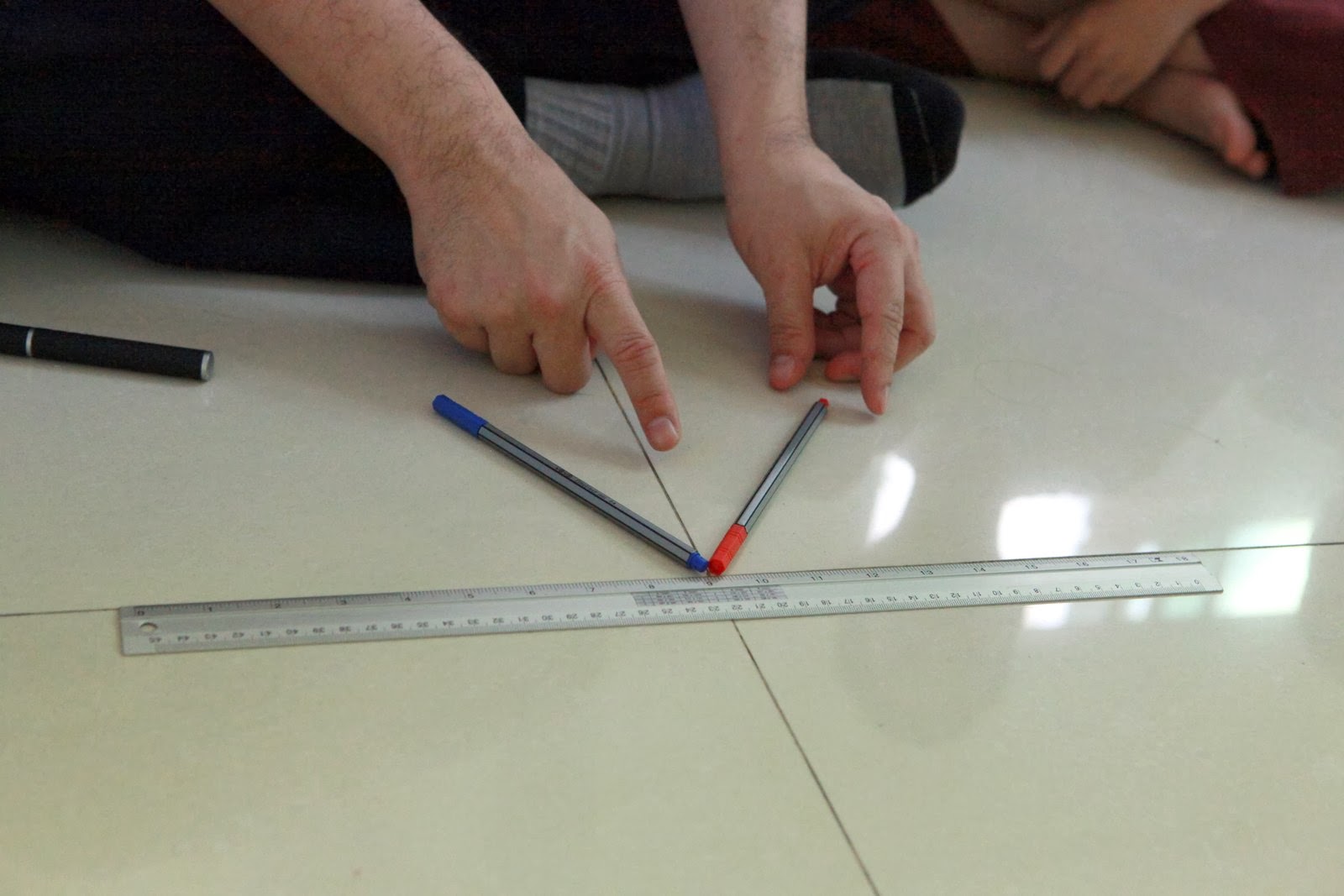 | ใช้ปากกาสีน้ำเงินแทนแสงวิ่งเข้าไปหากระจก ใช้ไม้บรรทัดแทนกระจก และใช้ปากกาสีแดงแทนแสงสะท้อน เส้นบนพื้นปูกระเบื้องแทนเส้นสมมุติที่ตั้งฉากกับกระจกตรงที่แสงโดนกระจก |