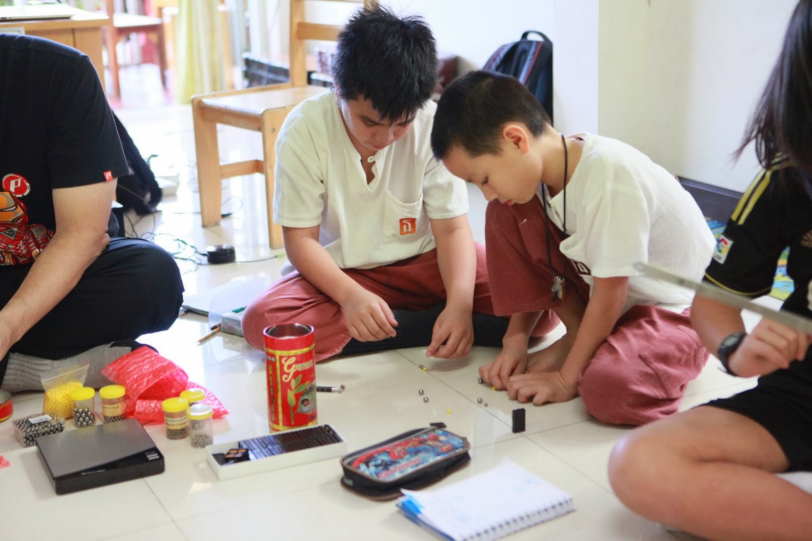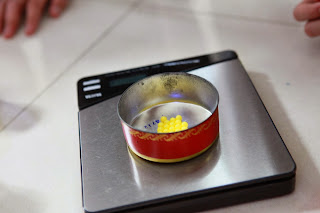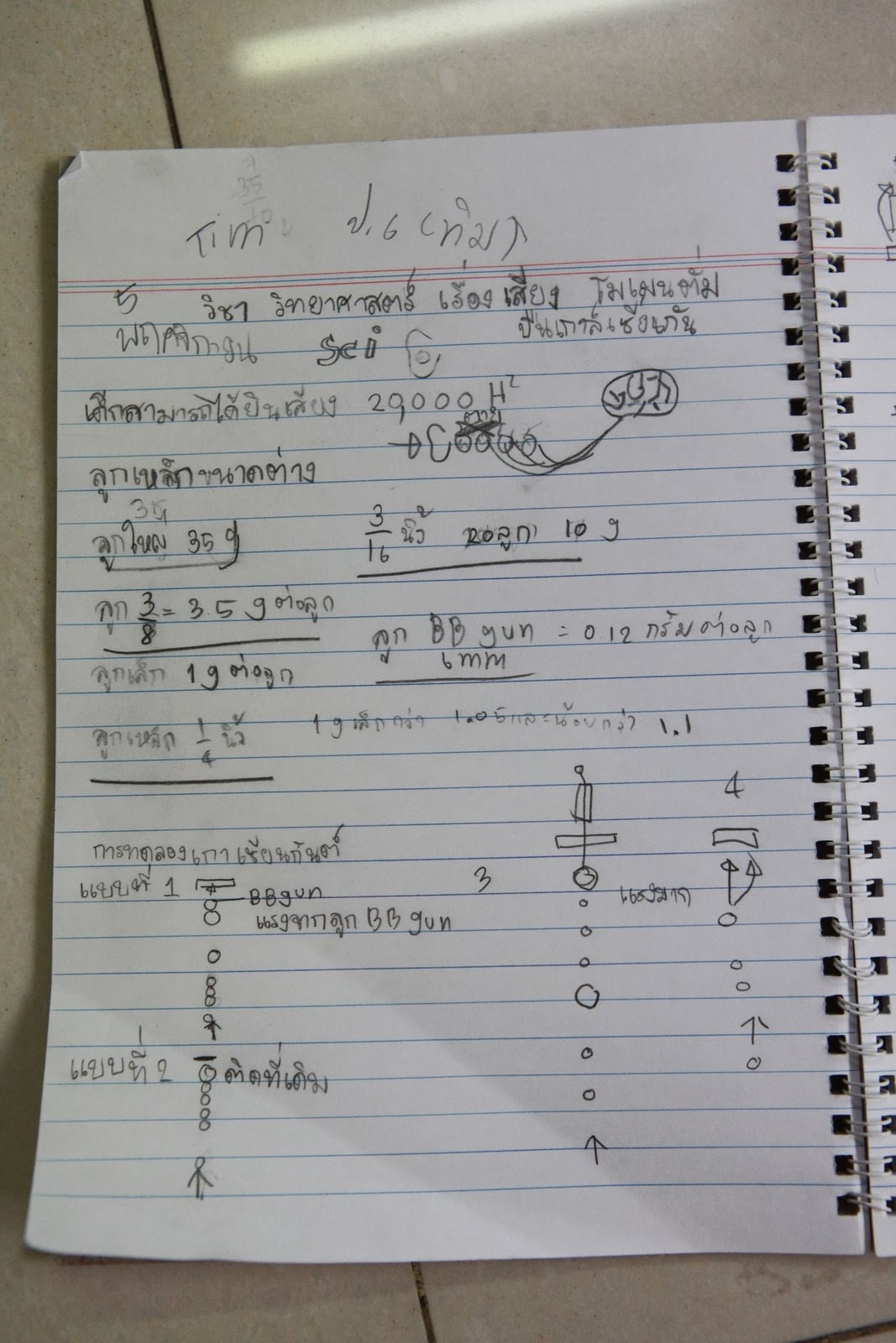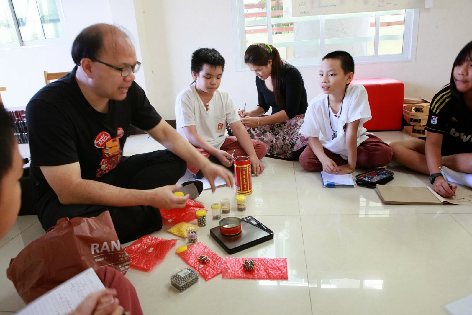 ผมแจกลูกเหล็กขนาดต่างๆ แม่เหล็กลูกใหญ่และเล็ก และเม็ดพลาสติกกลมที่เป็นกระสุน BB โดยเราชั่งน้ำหนักลูกกลมต่างๆไว้ ซึ่งพบว่าเม็ดพลาสติกเบากว่าเหล็กหลายเท่ามาก น้ำหนักลูกเหล็กขนาด 3/8" คือ 3.5 กรัม น้ำหนักลูกเหล็กขนาด 1/4" คือ 1.05 กรัม น้ำหนักลูกเหล็กขนาด 3/16" คือ 0.5 กรัม และลูก BB คือ 0.12 กรัม