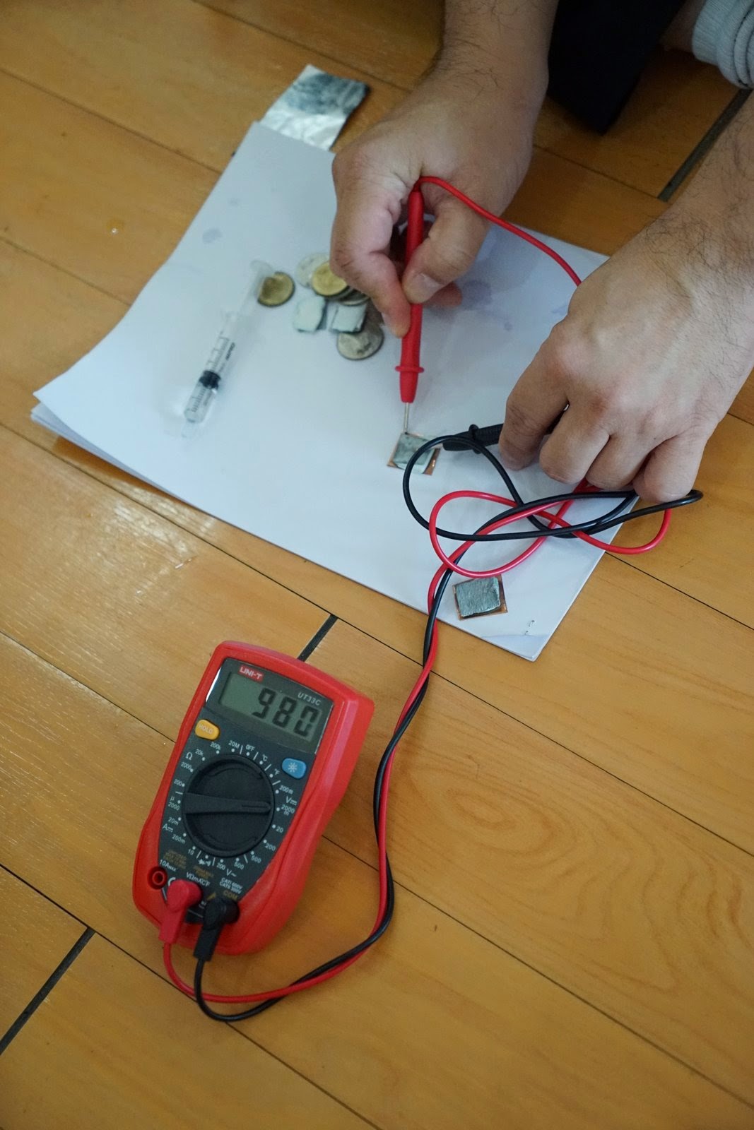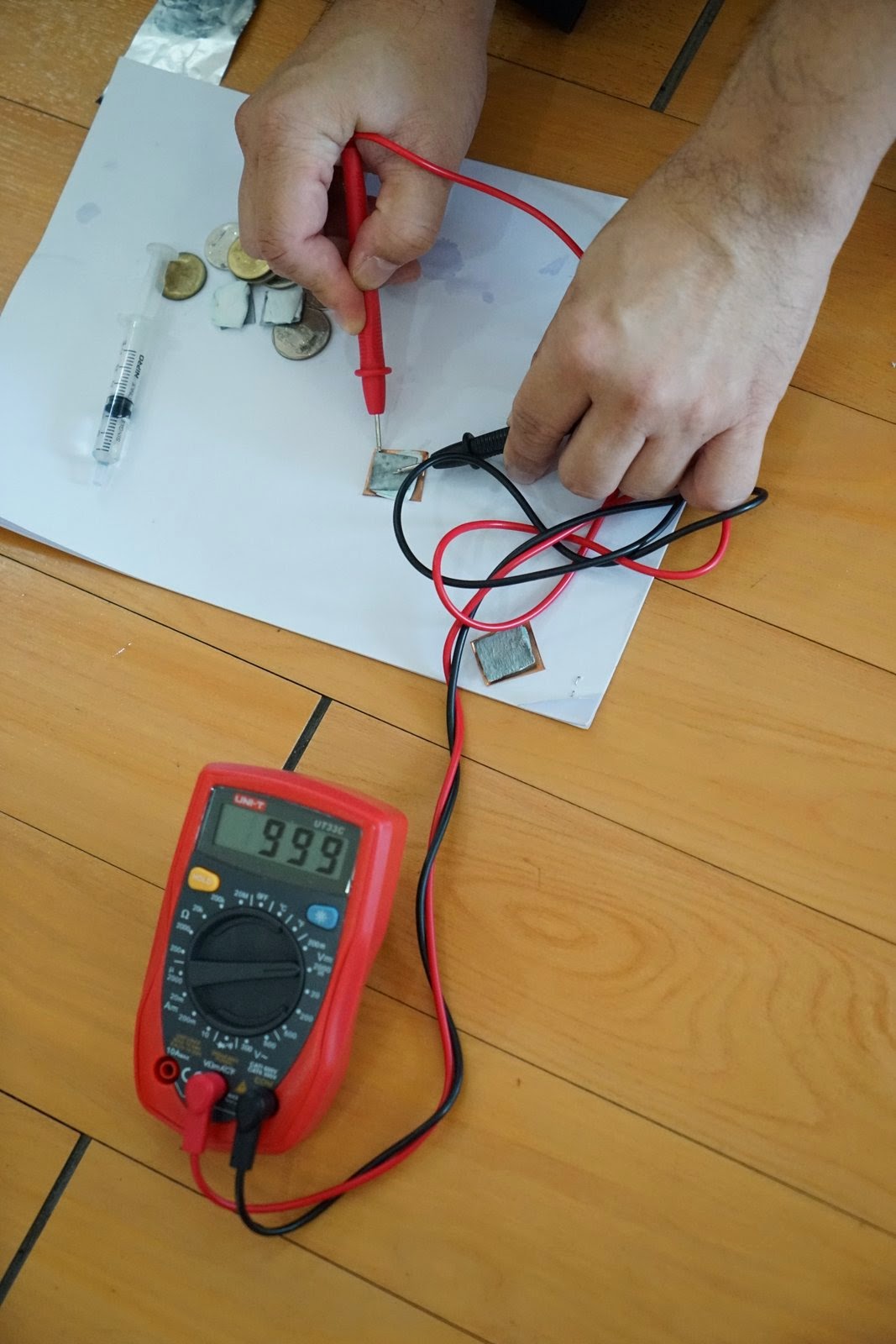 ในการทดลองของเรา เราใช้ทองแดง สังกะสี อลูมิเนียม และเหรียญชนิดต่างๆ เป็นขั้ว และใช้กระดาษจุ่มน้ำส้มสายชูคั่นระหว่างขั้ว มองๆดูก็เหมือนแซนด์วิชที่มีโลหะสองชนิดเป็นขนมปังและมีใส้เป็นกระดาษชุบน้ำส้มสายชู จากนั้นเราก็ลองวัดความต่างศักย์ระหว่างขั้วของแบตเตอรี่ของเรา พบว่า ทองแดง-น้ำส้มสายชู-สังกะสี มีความต่างศักย์ประมาณ 1 โวลท์ ทองแดง-น้ำส้มสายชู-อลูมิเนียมมีความต่างศักย์ประมาณ 0.25 โวลท์ และ อลูมิเนียม-น้ำส้มสายชู-สังกะสีมีความต่างศักย์ประมาณ 0.76 โวลท์ครับ ถ้าทั้งสองขั้วเป็นโลหะชนิดเดียวกันจะไม่มีความต่างศักย์ครับ เราพบว่าเราสามารถใช้เหรียญสิบ เหรียญห้า เหรียญสองบาท เหรียญห้าสิบสตางค์แทนทองแดงได้ครับ