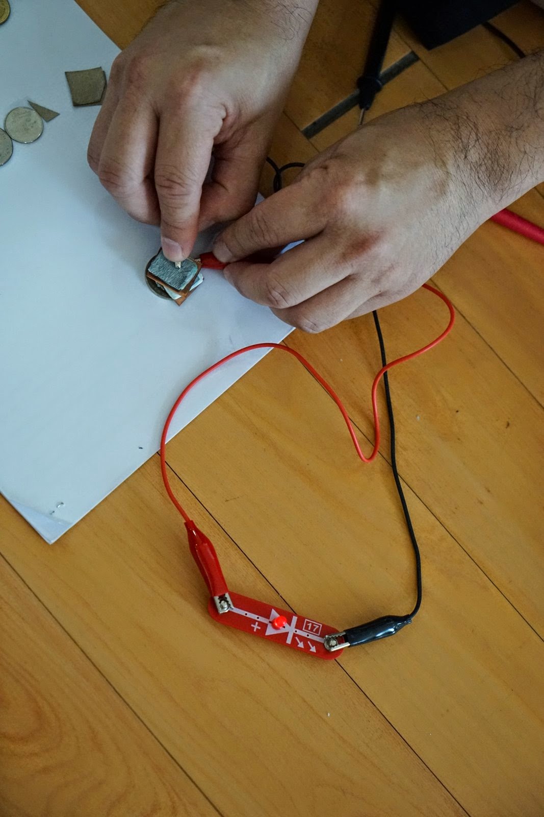 ผมยังไม่บอกเด็กๆเรื่องทฤษฎีว่าแบตเตอรี่ทำงานอย่างไรครับ ให้เขาเล่นๆไปก่อน ผมกำลังรอว่าจะมีใครสังเกตความสัมพันธ์ของชนิดโลหะที่ขั้วบ้างไหมครับ