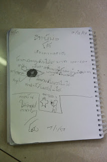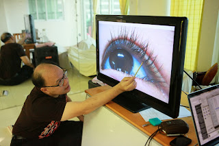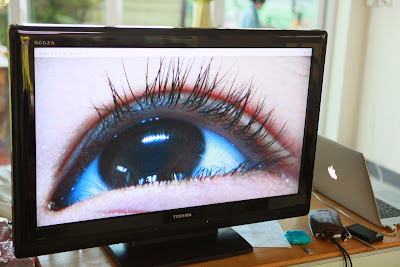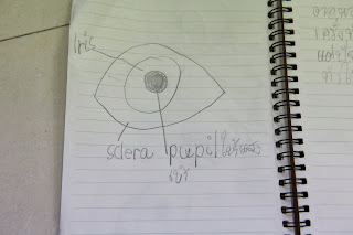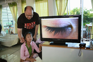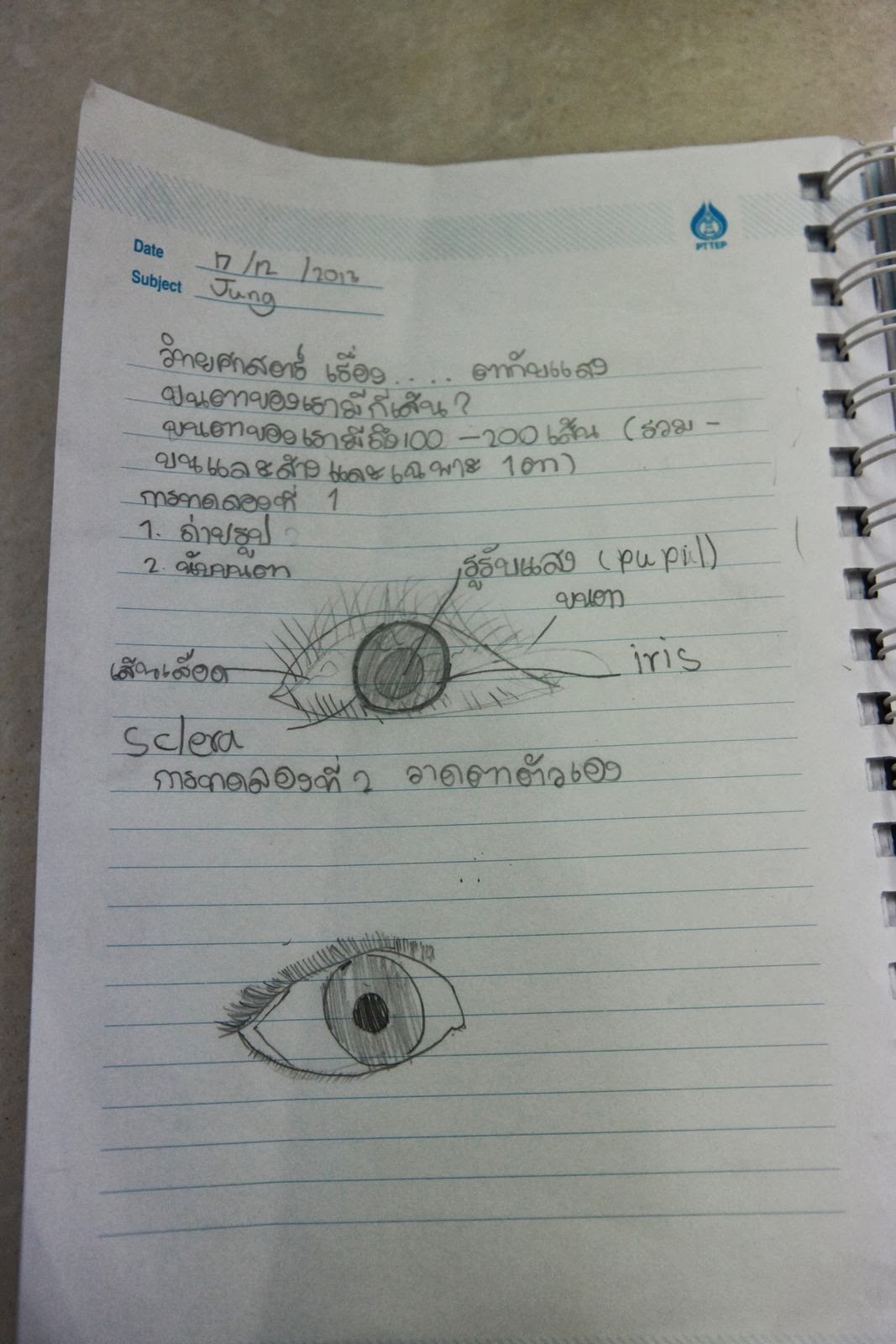 คุยกับเด็กๆเรื่องตา ภาพลวงตา เซลล์ร็อดและเซลล์โคน") เด็กๆจำจุดบอดในตาได้ดีครับ ขณะที่คุยกันอยู่เด็กป.1คนหนึ่งคือน้องแซ็คก็ถามว่าคนเรามีขนตากี่เส้น ผมก็ไม่รู้เหมือนกัน เราเลยหาทางนับขนตากันครับ ตอนแรกเรานับขนตาเพื่อนกันก่อนแต่นับยากมากเพราะมีการเคลื่อนไหว เราจึงถ่ายรูปแล้วเอารูปไปขยายให้ใหญ่ๆบนจอทีวีแล้วช่วยกันนับครับ
