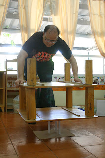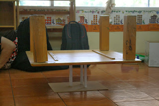 เราสามารถวางกล่องสีหนักๆรวมกับเบาะนั่งหลายอันได้ สามารถเอาโต๊ะไม้หนักๆที่เด็กๆใช้วาดรูปมาวางก็ได้ แต่เมื่อจะเอาโต๊ะไม้สองตัววางขาตั้งกระดาษก็ล้มลงครับ ปกติกระดาษ A4 หนึ่งแผ่นที่ม้วนเป็นทรงกระบอกแน่นๆจะรับน้ำหนักกดในแนวตั้งได้อย่างน้อย 5 กิโลกรัมครับ สามกระบอกก็รับได้ 15 กิโลกรัมถ้าเราวางน้ำหนักดีๆไม่ให้เอียงแล้วล้มพับไปทางใดทางหนึ่ง