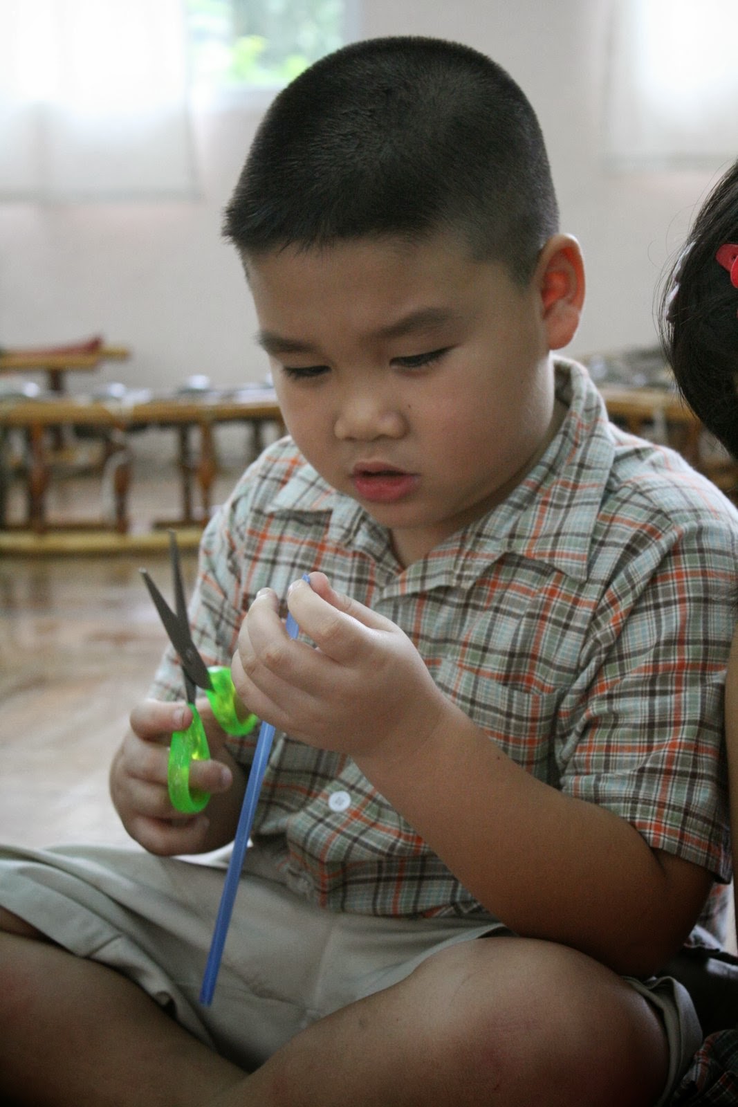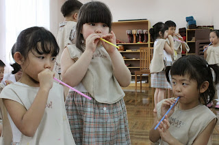 พอเด็กๆได้เห็นวิธีทำก็มารับหลอดไปคนละหลอดแล้วแยกย้ายกันไปทำเองครับ เป่ากันอย่างสนุกสนานและหนวกหูดีมาก ขณะที่เด็กๆทำปี่ของตัวเองผมก็หยิบถุงพลาสติกมาดึงให้ตึงๆแล้วเป่าตรงขอบพลาสติกบางๆนั้นเป็นเสียงเหมือนนกหวีดครับ เราสามารถใช้อะไรบางๆก็ได้เช่นกระดาษ ใบไม้ ถุงพลาสติก เอามาดึงให้ตึงๆแล้วเป่าที่ขอบ มันจะสั่นเป็นเสียงสูงๆ
