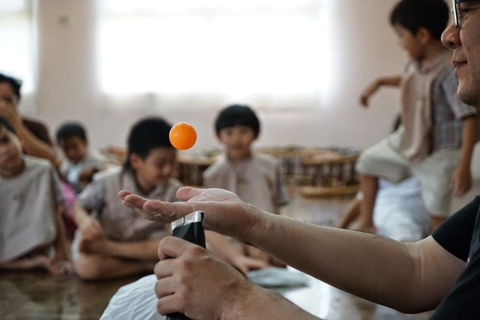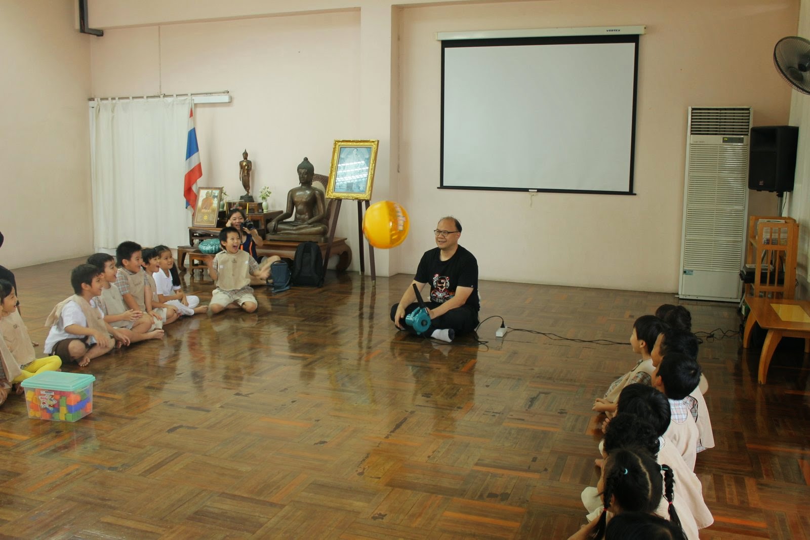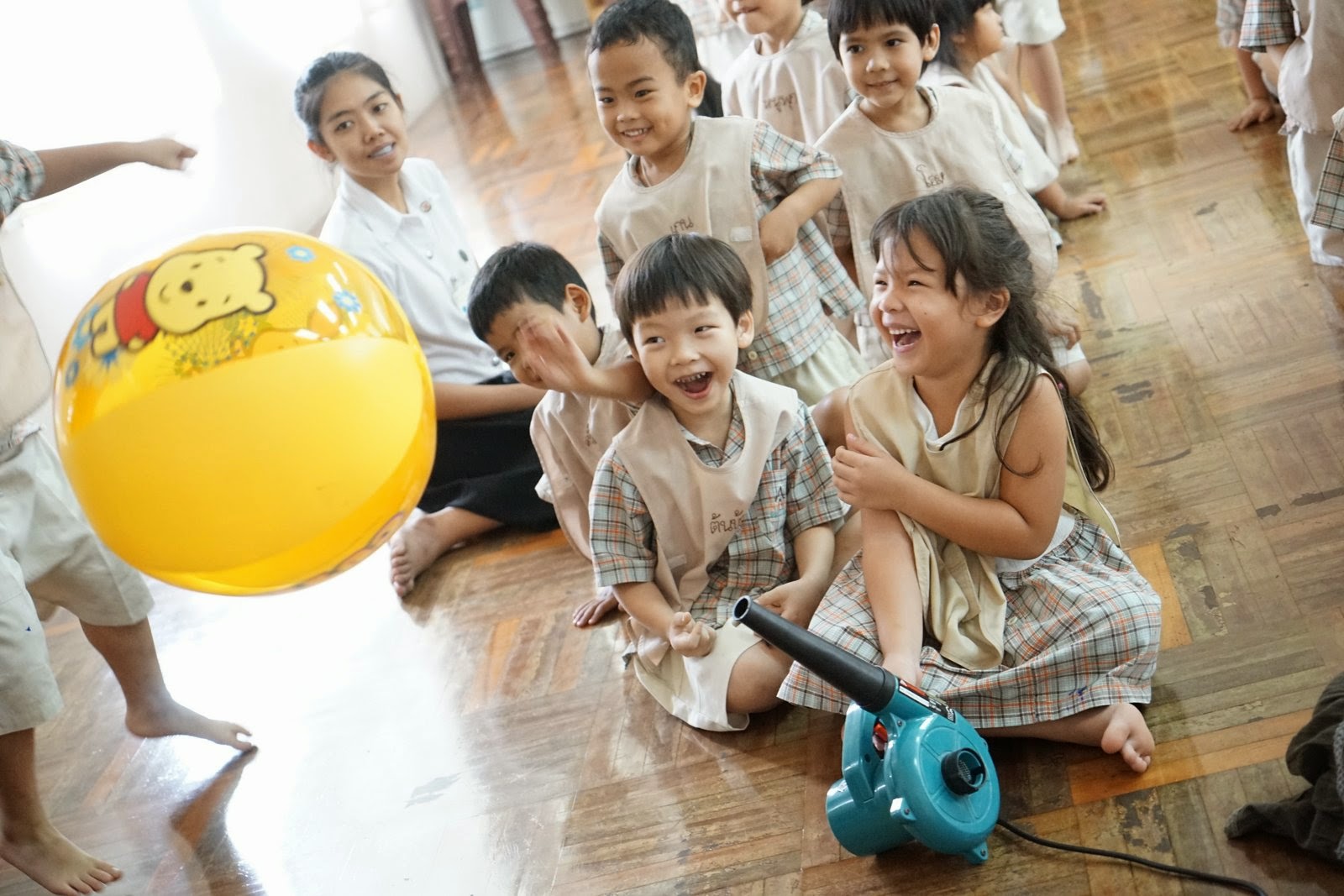 สำหรับเด็กอนุบาลสามผมเอาเครื่องเป่าผม+ลูกปิงปอง และเครื่องเป่าใบไม้+ลูกบอลชายหาด ไปเล่นกันครับ ถ้าเราเอาลูกบอลกลมไปอยู่ในสายลมแรงๆหน่อย กระแสลมจะแยกออกตามผิวลูกบอล และลมก็จะมีแรงผลักลูกบอล ทำให้หนีบลูกบอลอยู่ในกระแสลมได้ เหมือนตะเกียบคีบของครับ เด็กๆชอบมาก กรี๊ดกันใหญ่ (ผู้สนใจหลักการทางวิทยาศาสตร์ลองดู