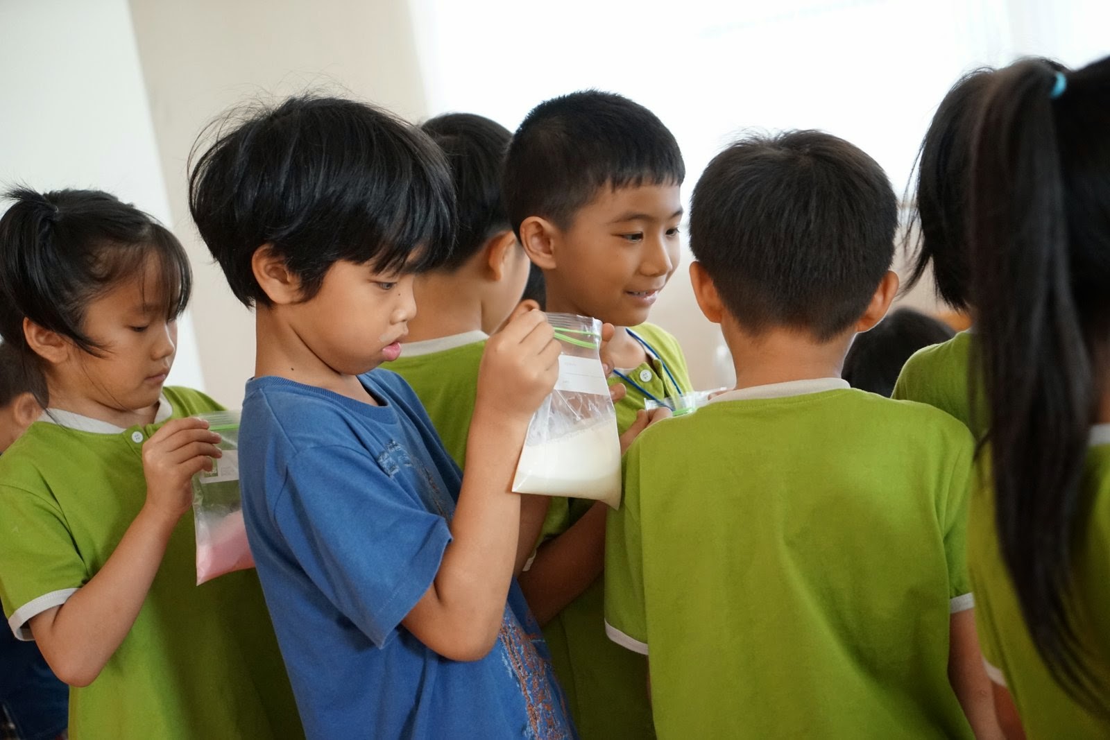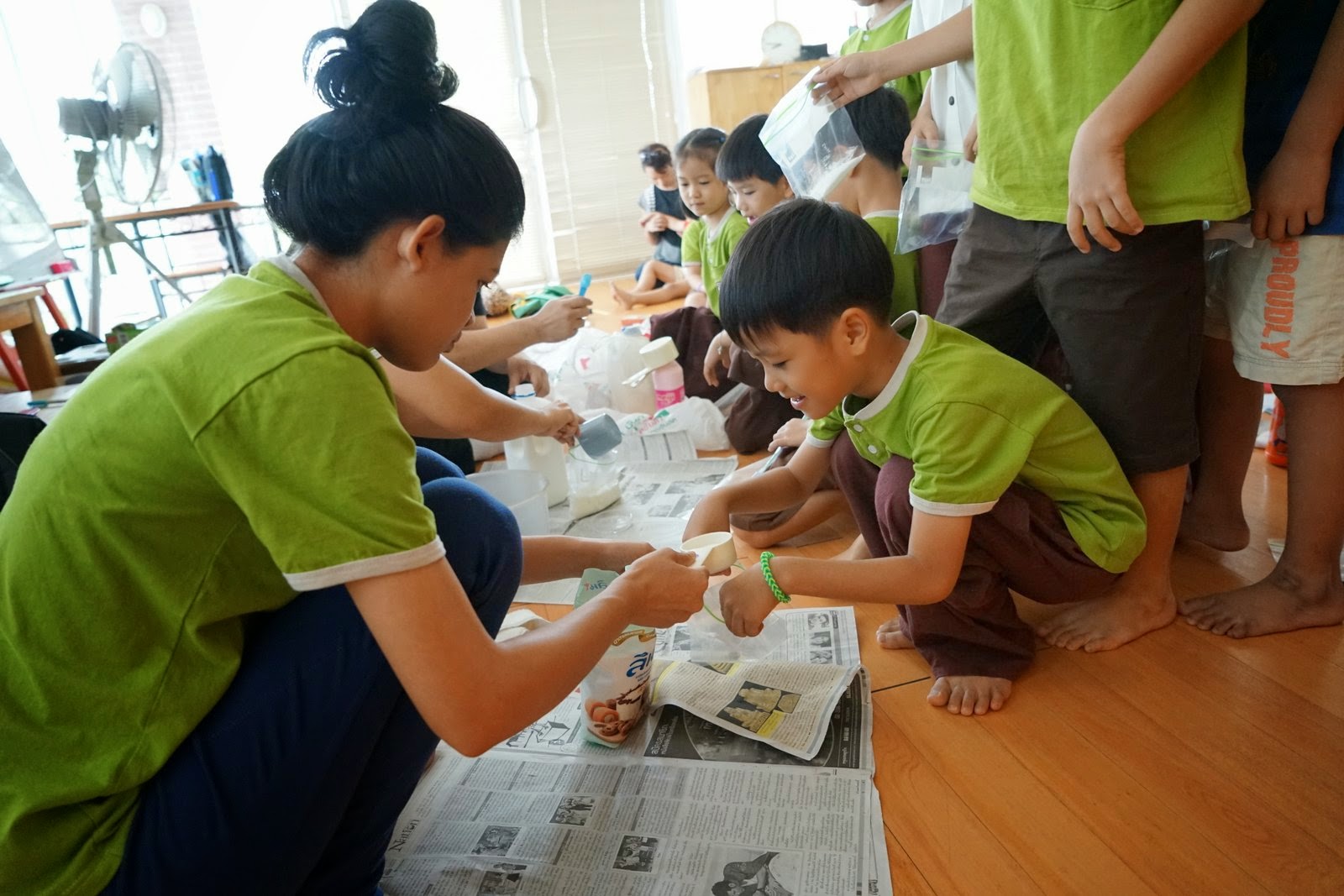 วันอังคารที่ผ่านมานี้ผมไปทำกิจกรรมวิทยาศาสตร์กับเด็กๆกลุ่มบ้านเรียนปฐมธรรมและอนุบาลบ้านพลอยภูมิครับ วันนี้เด็กๆประถมต้นได้ทำไอศครีมโดยเอานม น้ำตาล กลิ่นวานิลลามาผสมกันใส่ถุง แล้วเอาถุงไปใส่ในอีกถุงที่มีน้ำแข็งผสมเกลือให้ความเย็น แล้วเขย่าและนวดๆไปมา เราหมดเวลาก่อนที่ส่วนผสมจะแข็งครับ (รวมทั้งน้ำแข็งเรามีไม่ค่อยพอด้วยครับ) เลยเอาส่วนผสมไปแช่ช่องแข็งในตู้เย็น สำหรับเด็กประถมปลายเราพยายามปรับปรุงแอร์น้ำแข็งจากสัปดาห์ที่แล้วให้เย็นขึ้นและลมแรงขึ้นโดยการดูดอากาศออกและใส่น้ำแข็งโรยเกลือข้างใน สำหรับเด็กอนุบาลสามเราเล่น "ตะเกียบลม" กันโดยเอาเครื่องเป่าสนามมาเป่าลูกปิงปอง และใช้เครื่องเป่าผมมาเป่าลูกปิงปอง กระแสลมจะจับลูกบอลไว้ได้พอควรเหมือนเราคีบด้วยตะเกียบ