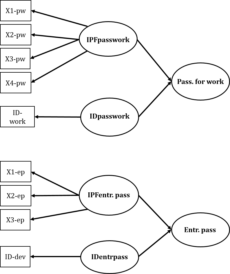 # model the relationships between each passion construct (pass.for work; Entr.pass) and its two dimensions of IPF... and ID... as formative!