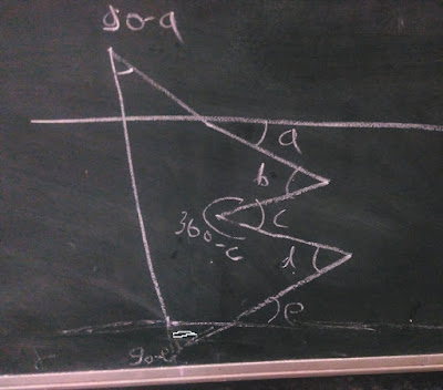 While some were engrossed in arriving at the solution, I could see that few were unable to find a break though... So I asked them to "actually construct this diagram using a scale and then measure the angles a,b, c and d to really find out if there is any relation..."