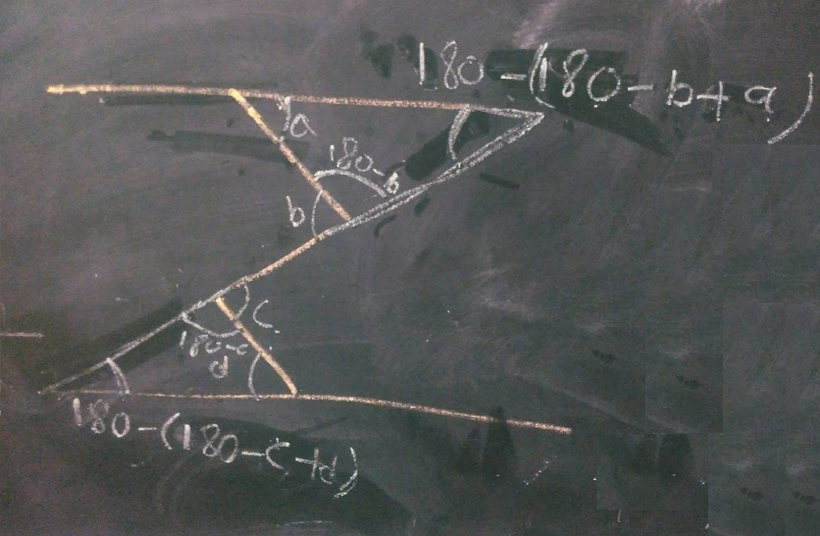 You can see that she has extended the two inclined lines to meet the parallel lines to form two triangles. Then she claimed that the angles 180-(180-c+d) and 180-(180-b+a) will be equal as they form a pair of alternate angles and hence, d-c = a-b means
