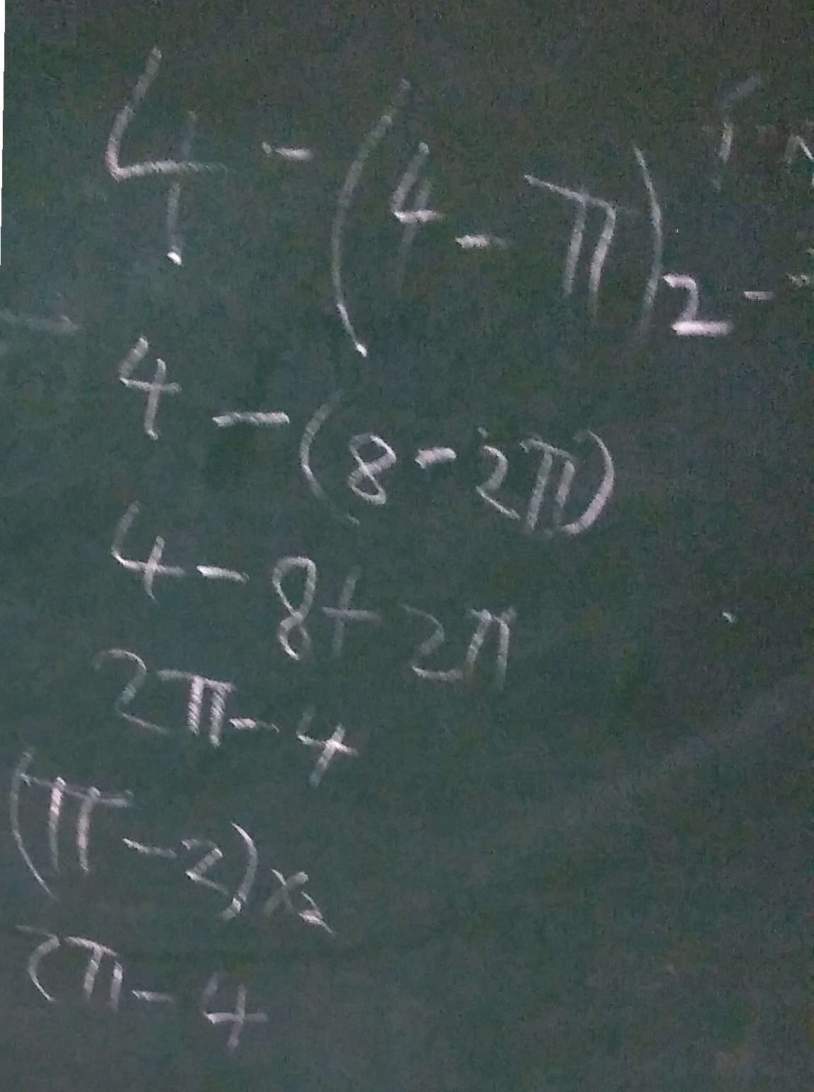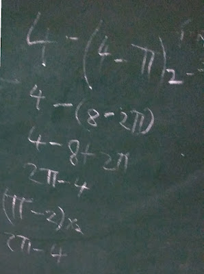 This is what she has shown adjacent to her first approach above... Now if you observe the two expressions obtained don't appear equal directly. So I teased her that the two answers are different. I was glad that she countered me saying that they are equivalent. She simplified her first solution to (2 pi - 4) orally :)