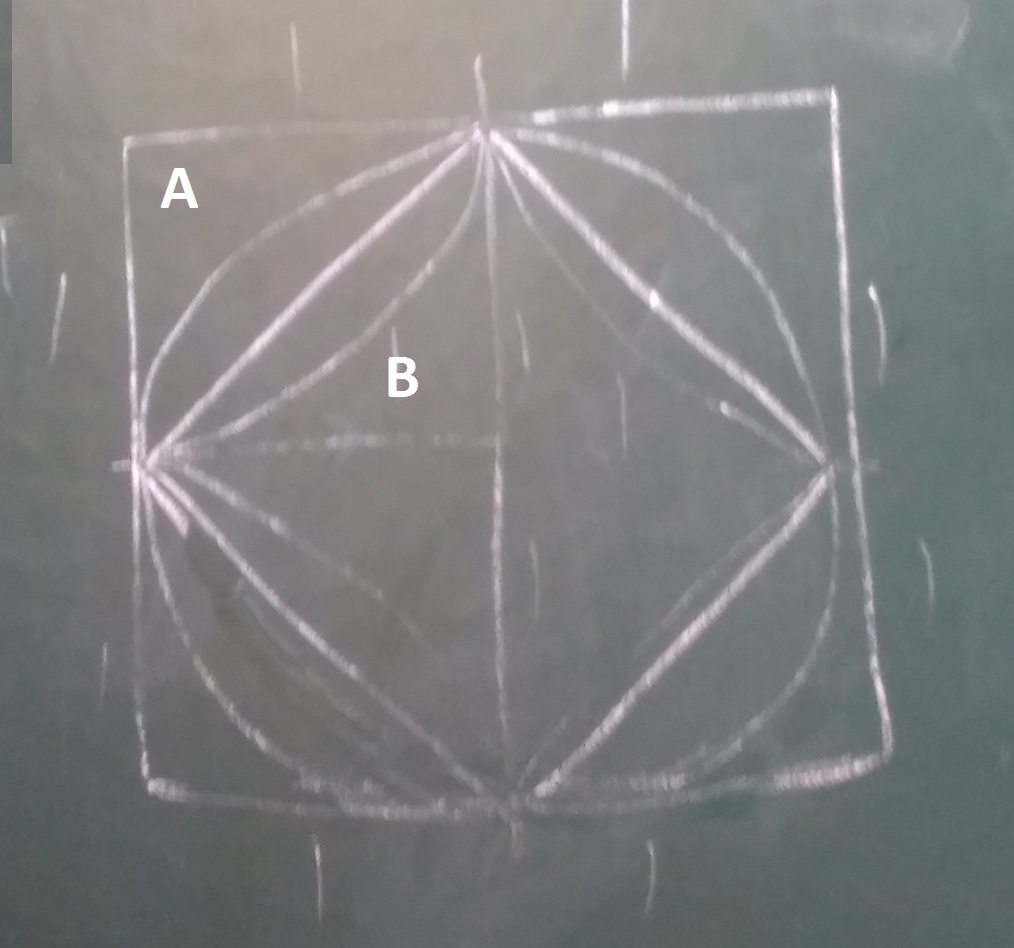 Look at the figure above. She said that the Area of regions A and B are same. There are eight such identical regions, each with Area = (4 - pi) / 4.