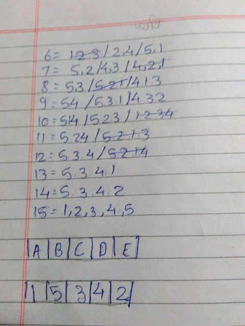 Later, she wrote down all the possible ways of making every number from 6 to 15 (though she later said there was no need to write for 13 to 15 again :)