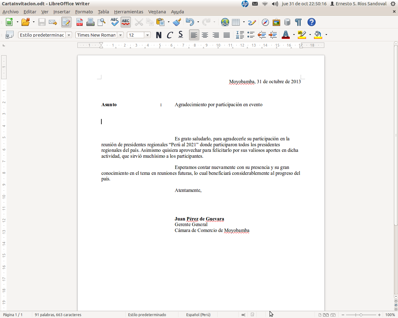 la carta de invitación con LibreOffice Writer y posicionamos el cursor