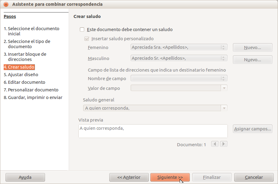 Finalizada la inserción del bloque de direcciones haremos click en el botón Siguiente.