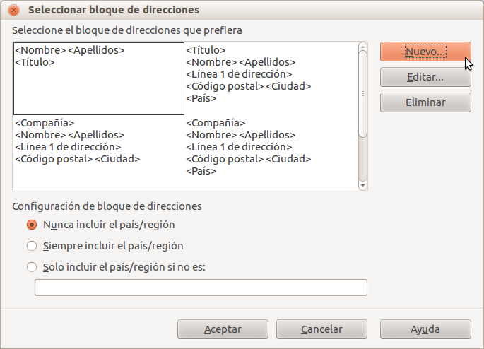 La selección del bloque de direcciones configurado quedaría como se muestra en la imagen. Haremos click en el botón Aceptar.