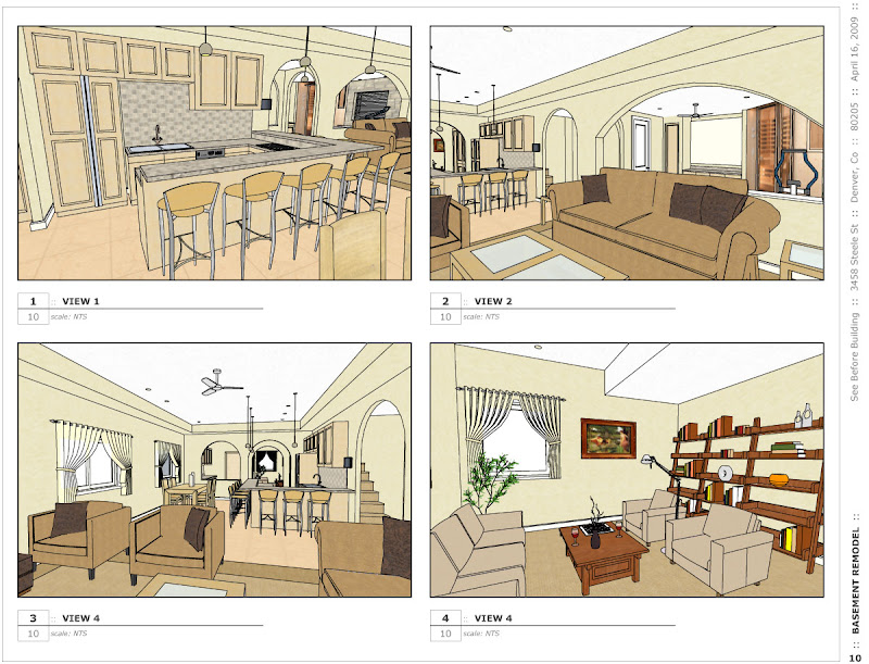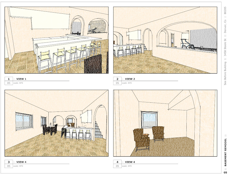 At See Before Building I also offer "real-time" design services. Recently I was hired by a Denver couple to design their new basement. When sitting down for a design session like this I need a fast modeling tool so that I can modify the design right in front of the client as they make suggestions. Also, I need a way to present different iterations of the design without having to recreate the presentation from scratch for each review.