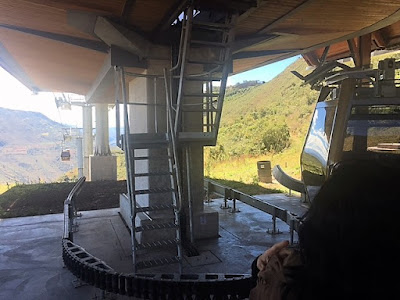 A las 9.00 a.m. empieza el servicio de las telecabinas cuyo aforo es un máximo de seis personas. Estuvimos entre los primeros que embarcaron. Presas de la emoción contemplamos desde muy arriba la cañada del rio Tingo, las montañas todas verde claro, los caminos, las casas y chacras en la lejanía; todo eso mientras el artilugio colgado del cable que pendía de las altas torres que aparecían cada cierta distancia, ascendía desplazándose con velocidad moderada.