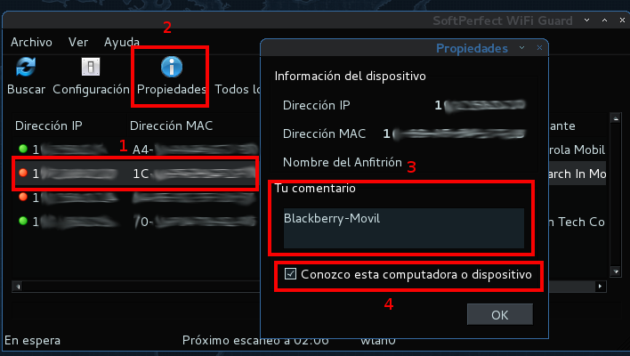 -Nos ubicamos en cualquier dispositivo de color "ROJO" y se nos activara la opción de "PROPIEDADES" le daremos click y se nos abrirá una ventada nueva donde nos muestra la dirección IP y la Mac address mas abajo nos ubicamos donde dice tu comentario y le ponemos un nombre a ese dispositivo, en mi caso ese