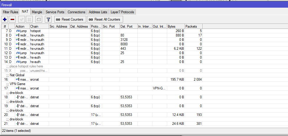 NAT adalah pengalihan suatu alamat IP ke alamat yang lain. Apabila suatu paket dialihkan dengan NAT pada suatu link, maka pada saat ada paket kembali dari tujuan maka link ini akan mengingat darimana asal dari paket itu, sehingga komunikasi akan berjalan seperti biasa.Pada menu Firewall ? NAT terdapat 2 macam opsi chain yang tersedia, yaitu dst-nat dan src-nat. Dan fungsi dari NAT sendiri adalah untuk melakukan pengubahan Source Address maupun Destination Address. Kemudian fungsi dari masing-masing chain tersebut adalah sebagai berikut: