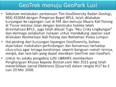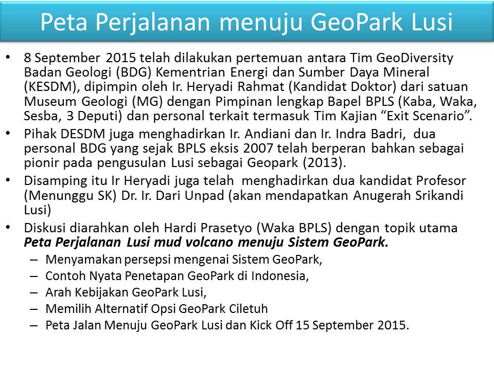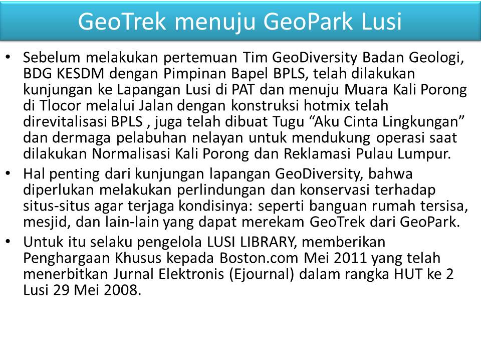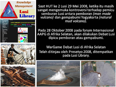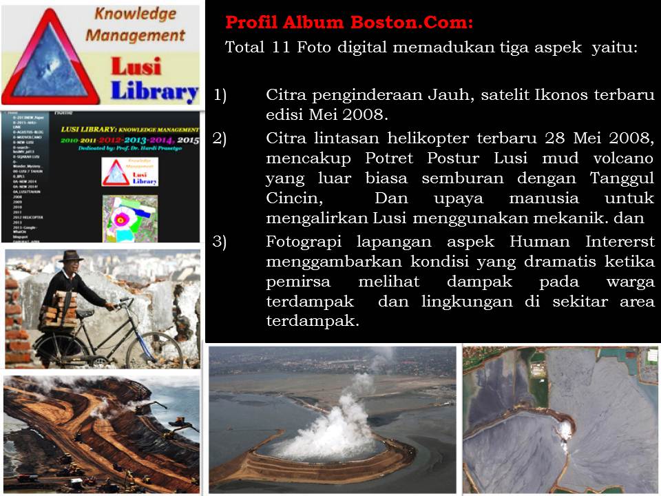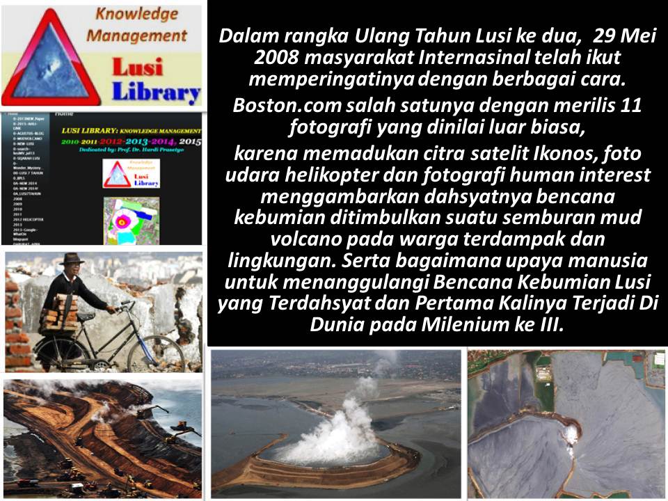 2015 LUSI LIBRAY AWARD: DARI BOSTON.COM KE GEOTREK, PETA JALAN GEOPARK LUSI Dipersembahkan Oleh Prof. Dr. Hardi Prasetyo, Inisiator dan pengelola Lusi Library:Knowledge Management 2010. ![]() Pernyataan Penghargaan Lusi Library:Knowledge Management 2010 kepada Penerbitan Boston.com The Big Picture, 11 Juni 2008, dalam rangka HUT LUSI 29 Mei 2008 Penghargaan kepada Boston. Com atas penerbitan Ebook sebagai alatbantu mendukung GeoTrek dari GeoPark Lusi Selaku pengelola LUSI LIBRARY:KNOWLEDGE MANAGEMENT 2010, kami Prof. Dr. Ir. Hardi Prasetyo (Waka Bapel BPLS), Pejabat Penugasan dari Kemmentrian Energi dan Sumber Daya Mineral (KESDM) 2007, mantan Sekjen DPP Masyarakat Penginderaan Jauh Indonesia (MAPIN). Pada hari ini 9 September 2015 mendeklareasikan untuk memberikan Penghargaan Khusus kepada Boston.com Atas penerbitan yang dinilai luar biasa pada Jurnal Elektronis (Ejournal)TOPIK THE BIG PICTURE 11 JUNI 2008, dalam rangka HUT ke 2 Lusi 29 Mei 2008, mencakup: citra penginderaan jauh dibarengi foto-foto yang memberikan implikasi luas pada misi penanggulangan Bencana Kebumian Lusi serta penyusunan Geotrek dan GeoPark Lusi ke depan. Profil Album Boston.Com: Total 11 Gambar memadukan tiga aspek yaitu citra penginderaan Jauh satelit Ikonos terbaru edisi Mei 2008, pengindeaan jauh lintasan helikopter terbaru 28 Mei 2008, dan fotograpi lapangan mencakup Potret Postur Lusi mud volcano yang luar biasa semburan dengan Tanggul Cincin, serta menggambarkan Upaya Manusia untuk mengalirkan Lusi melalui mekanik. Disamping itu aspek Human Intererst foto dramatis melihat dampak pada warga terdampak dan lingkungan di sekitar area terdampak. Selamat kepada Pimpinan Boston.Com, tidak ada istilah Terlambat dari suatu karya yang dinilai luar biasa memberikan kemanfaatan kepada umat manusia dalam Penanggulangan Bencana Kebumian Lusi mud volcano. Hormat Kami Prof. Dr. Hardi Prasetyo, Inisiator dan pengelola Lusi Library:Knowledge Management 2010. Dalam rangka Ulang Tahun Lusi ke dua, 29 Mei 2008 masyarakat Internasinal telah ikut memperingatinya dengan berbagai cara. Boston.com salah satunya dengan merilis 11 fotografi yang dinilai luar biasa, karena memadukan citra satelit Ikonos, foto udara helikopter dan fotografi human interest menggambarkan dahsyatnya bencana kebumian ditimbulkan suatu semburan mud volcano pada warga terdampak dan lingkungan. Serta bagaimana upaya manusia untuk menanggulangi Bencana Kebumian Lusi yang Terdahsyat dan Pertama Kalinya Terjadi Di Dunia pada Milenium ke III. Saat HUT ke 2 Lusi 29 Mei 2008, ketika itu masih sangat mengemuka kontroversi terhadap pemicu semburan Lusi antara pemboran (man made vulcano) dan gempabumi Yogyakarta (natural mud volcano). Pada 28 Oktober 2008 pada forum Internasional AAPG di Afrika Selatan, akan dilakukan Debat Lusi dipicu pemboran atau gempabumi. WarGame Debat Lusi di Afrika Selatan telah ditinjau oleh Presetyo 2008, ditempatkan pada Lusi Library. Profil Album Boston.Com: Total 11 Foto digital memadukan tiga aspek yaitu: 1)Citra penginderaan Jauh, satelit Ikonos terbaru edisi Mei 2008. 2)Citra lintasan helikopter terbaru 28 Mei 2008, mencakup Potret Postur Lusi mud volcano yang luar biasa semburan dengan Tanggul Cincin, Dan upaya manusia untuk mengalirkan Lusi menggunakan mekanik. dan 3)Fotograpi lapangan aspek Human Intererst menggambarkan kondisi yang dramatis ketika pemirsa melihat dampak pada warga terdampak dan lingkungan di sekitar area terdampak LINK FOTO: 1 ![]() 2. ![]() 3. ![]() 4. ![]() 5. ![]() 6. ![]() 7. ![]() 8. ![]() |