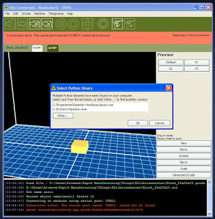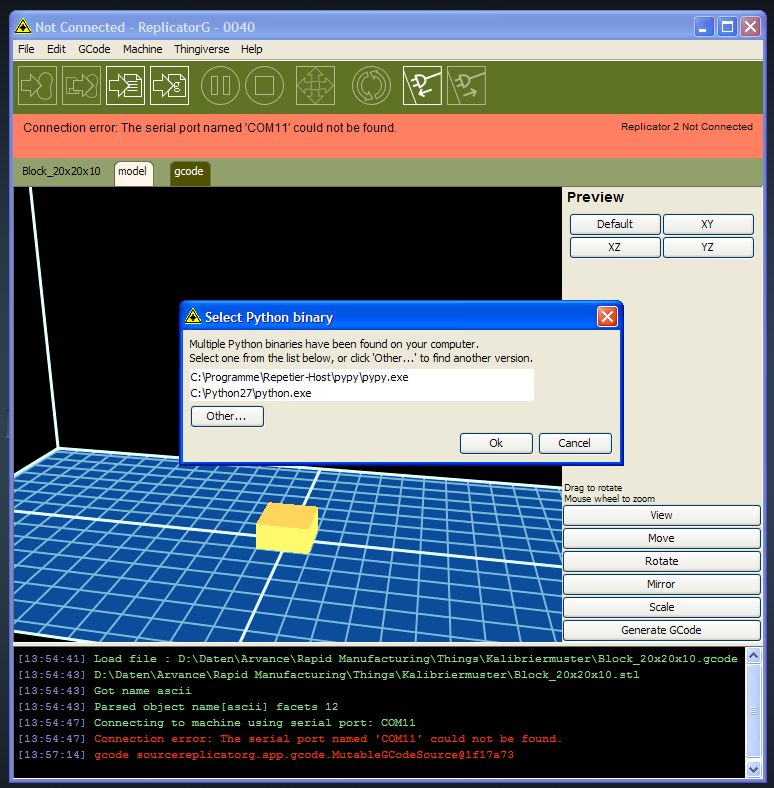 Then I switched ReplicatorG0040 (non Sailfish) to pypy.exe in the Repetier host directory via the advanced preferences menue.