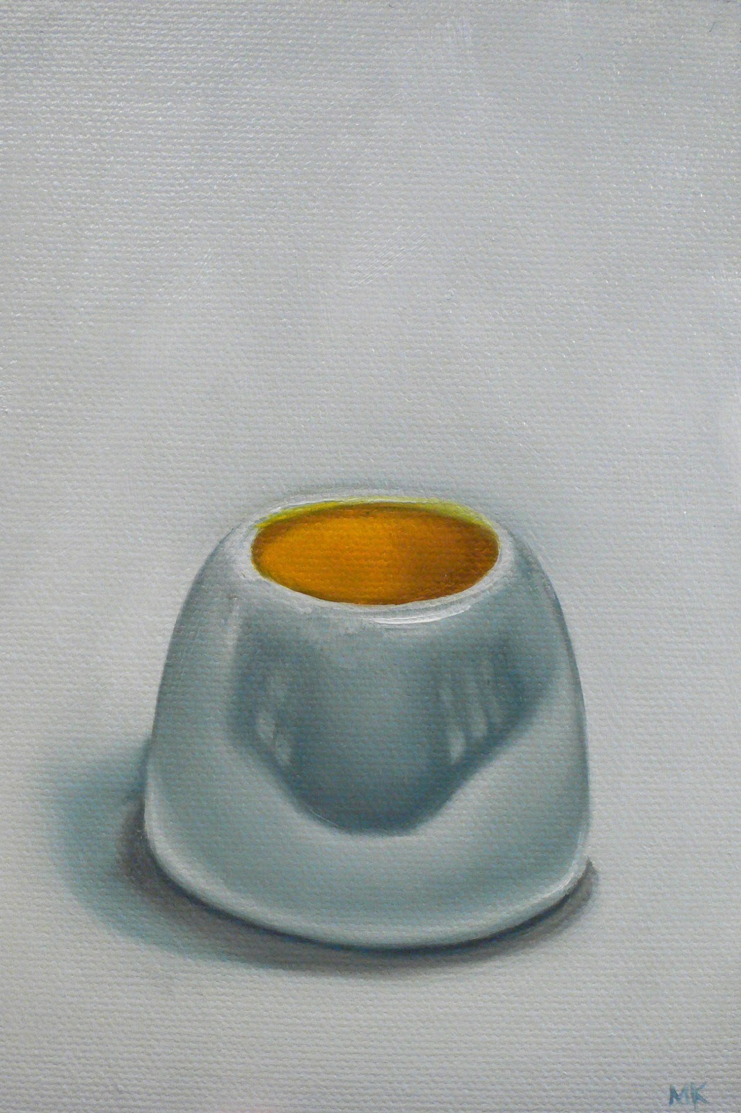 Ok ok I know. This is the third egg cup. And I have one more to do. In the 15 years that I have been painting, I have only painted the same thing twice, once. (And yes, that does make sense.) I don't like to paint the same thing over again. At least that's what I thought. Painting the same thing three times is fantastic! I don't know if they are getting progressively better, but it's so interesting for me to see how the outside light affects the reflections on the cup as well as the background. Of course, these are small paintings. Let's see if I ever get around to doing a large painting over and over.