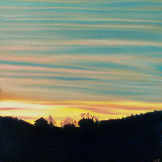 This painting is of an image taken while driving from Berlin to Blonay, Switzerland. It's about a 9 hour drive, give or take an hour.... or three. We started our journey at dawn and arrived in Blonay at dusk, which, from an artist's perspective, is pretty convenient. And rather poetic, actually. When I saw this sunset I made my husband immediately get off at the first stop he saw, which involved some pretty interesting driving... But it was totally worth it. I shot off about 20 photos, several of which are on deck for future paintings. They are very special to me, so they have been moved to the "only paint when you have a lot of time" pile. I really love (and need) to drink in the photo as I'm painting it. It takes me right back to the place and the time it was taken. Just looking at this, I can still feel the chill in the air and smell it's wintery mountain freshness..