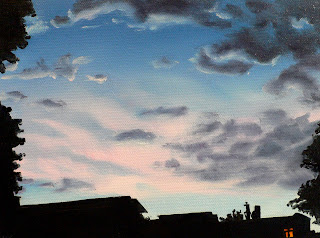 Ahhhhhh...... I always forget how wonderful it is to paint until I can't do it. And oh how I love to paint skies. This is the start of a series I have been planning for over a year. I want to start on the small panels and eventually (when I have time) move to very large canvases. I am so excited to get started.... But, with both kids having just woken up from their naps, at the exact same time, creating complete havoc in their respective rooms (one is having coughing fits while the other seems to be taking apart his crib by way of some sort of blunt object and then throwing the pieces at the wall- or so it sounds), I have to apologize for the terrible photo. I am more than a little distracted......