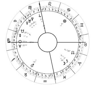 Here's my chart. The house cusps are not shown because I use whole sign houses, where the entire sign where the Ascendant falls is the first house, the next sign the second house, and so forth. The arrow pointing to the left is the Ascendant; the upward-pointing arrow is the Midheaven. How it works is that the planets move clockwise through the chart as they would during the course of the day; a quarter of the way through will cover the native's entire life.