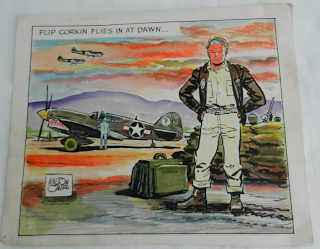 This very interesting piece sold on Ebay last week for $543 (don't worry, honey, not to me). It measures 11x13 on heavy card stock. It seems to me to be a beautiful Milton Caniff original watercolor of Flip Corkin, with a Curtiss P-40 "Flying Tiger" in the background.