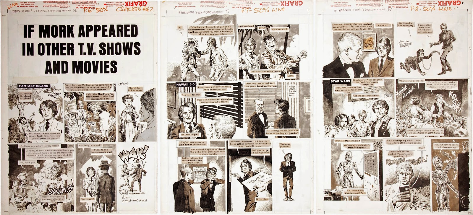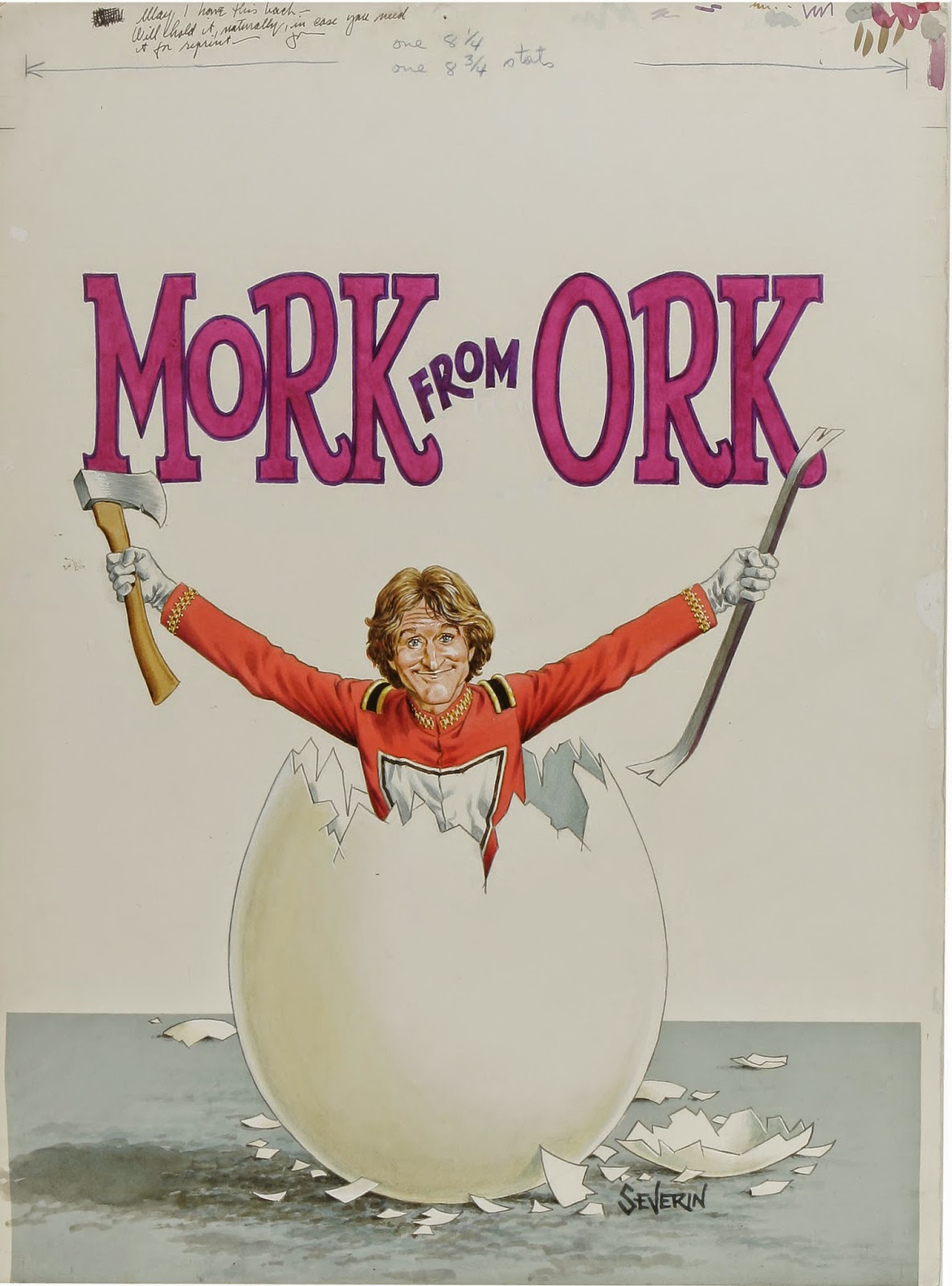 Robin Williams' TV character Mork was a pop culture phenomenon. His wacky, anything goes style fit perfectly with Cracked Magazine's askew take on the world. Cracked loved Mork, featuring him on the cover of seven issues within 1979 and 1980. He was so popular he edged out Gary Coleman and Penny Marshall, two other Cracked favorites, for cover face time. Covers meant be drawn by Cracked mainstay John Severin. Severin, a legendary comics artist with a knack for likenesses, seems like he had fun drawing Williams' malleable mug.