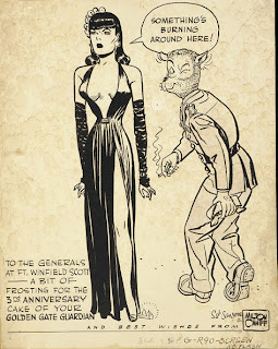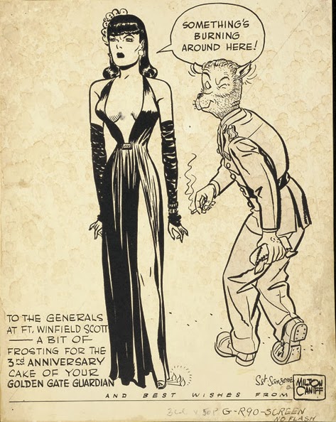 Alter Ego.  Sansone was a contemporary of Milton Caniff during WWII.  Both had popular strips published by Camp Newspaper Services.  Caniff had "Male Call," starring Miss Lace, an affable pin-up come to life.  Sansone had "The Wolf," a leering lycanthrope-headed G.I. on the make.  The article features an interview with Sansone's widow, providing insight into "The Wolf" and Sansone's other work.  There are remembrances of Caniff and a page of specialty crossover art with the two characters appearing together (see above).