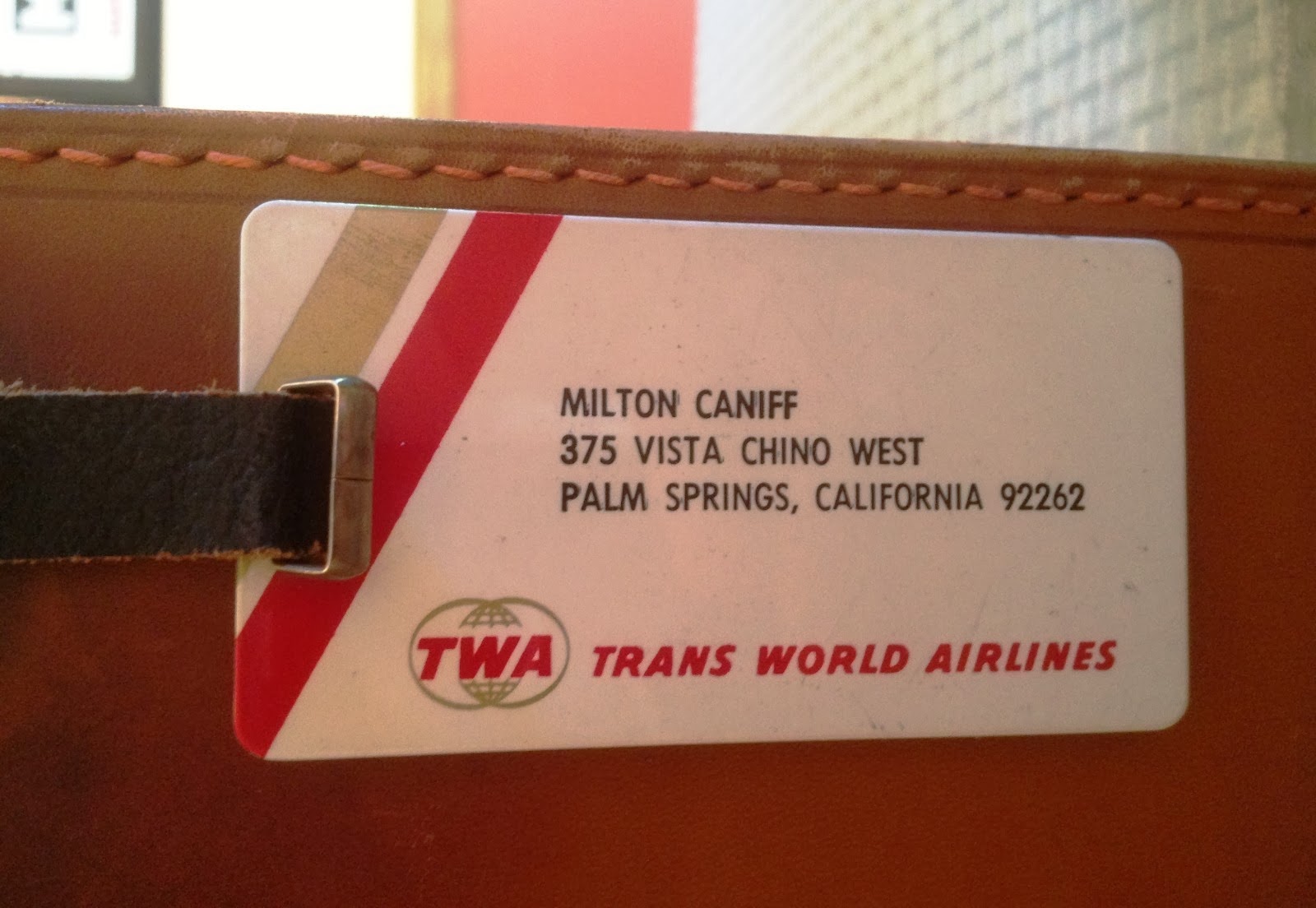 Here is a special rarity indeed - a personal item of Milton Caniff's.  Caniff's great-great grand nephew recently sold some Caniff items on Ebay.  The item pictured above was Caniff's traveling liquor case.  As you can see from the first picture, the case was marked with his initials (for Milton Arthur Caniff).  The airline card has his Palm Springs address.  I know nothing of Caniff's drinking habits, though he did appear in print ads for Teacher's Scotch and Walker's DeLuxe.  My dad had one of these cases and I remember wanting to be the one to carry it in from the trunk to the hotel room on trips.  Caniff's case sold at auction for $127.