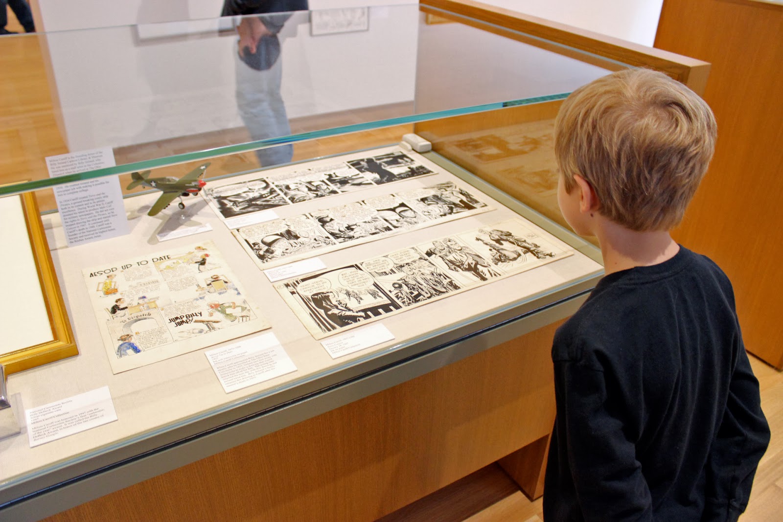 My son Noah looking at the all-Caniff display case. This case included a painted Caniff self-portrait, one strip apiece of "Terry and the Pirates," "Male Call" and "Steve Canyon," and 'Aesop Up to Date,' the cartoon that secured him a job at the Columbus Dispatch. Dispatch editor Billy Ireland had asked Caniff for a cartoon that would make him "jump out of his chair."