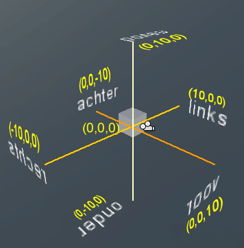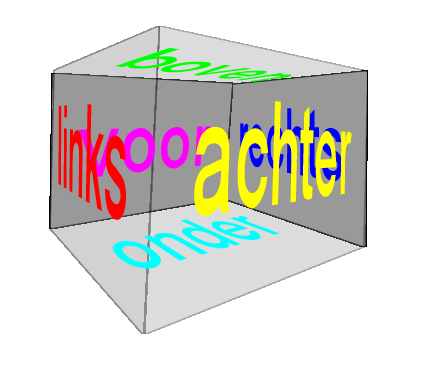 Een eerste oefening met UnityWij kunnen ons inmiddels oriënteren in de ruimte van Unity met behulp van een linkshandig orthogonaal assenstelsel en Eulerhoeken. Om dit te oefenen gaan wij een een vlak voor, achter, links, rechts, boven en onder de camera plaatsen. Om te zien tegen welk vlak wij aankijken, is het makkelijk om deze informatie op het vlak zelf te plaatsen. Dus op het vlak voor de camera plaatsen wij de tekst "voor", enz.
