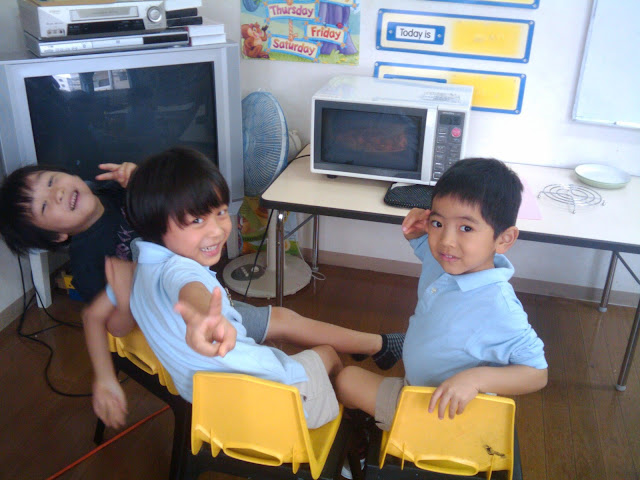 | The boys patiently and eagerly watching the cookies bake |