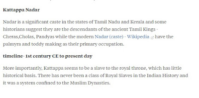 So the author of this post made up this link: Karikala Katappa - Karikala Cholan - Descendents of Cholas. He assumed Nadars were the descendants of Cholas. They are not. He then puts a note clariying things, but soon someone will make a connection that Nadars were backward caste, so they could have been slaves. And if they are descendants of Tamil kings, someone will come to a conclusion that Tamil kings were once slaves to Satavahanas.