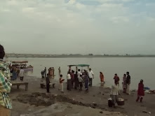 இந்தப் பாறை தான், ஶ்ரீராமர், சீதை அமர்ந்திருந்ததாகச் சொல்லப்படுகிறது. சாய்ந்தாற்போல் உட்கார்ந்திருப்பவர் தான் பண்டிட். பின்னால் தெரிவது மந்தாகினி நதி.அதே காட்சிமந்தாகினி நதிக்கரையில் அமர்ந்திருக்கும் ஒரு தொழிலாளி.