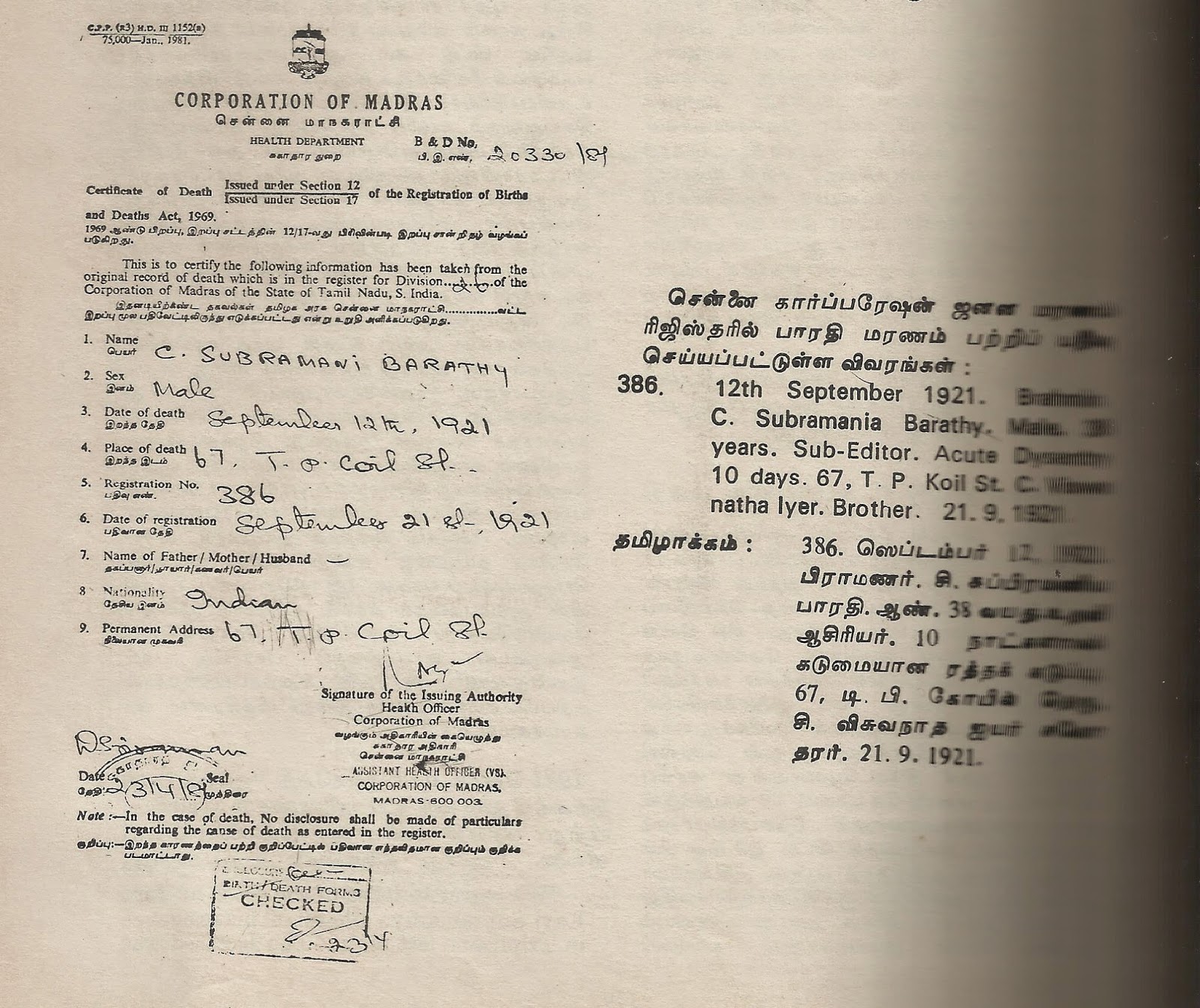இந்த ஆவணம் அசலா அல்லது இணையதள அல்வாவா என்பதை முதலில் அறியவேண்டும். பதிவேட்டில் இறப்புக்கான காரணம் எழுதப்பட்டிருந்தும் காப்புரிமை காரணமாக வெளியிடவில்லை என்ற குறிப்புள்ளதே. அந்த அடிப்படையில் தகவல் அறியும் உரிமையின்கீழ் இறப்புக்கான காரணம் என்ன எனபதை அறியலாமேரு.பூனை