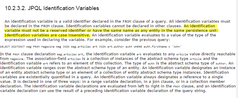 If I change the name in @Entity or the identifiers in the JPQL the error goes away.