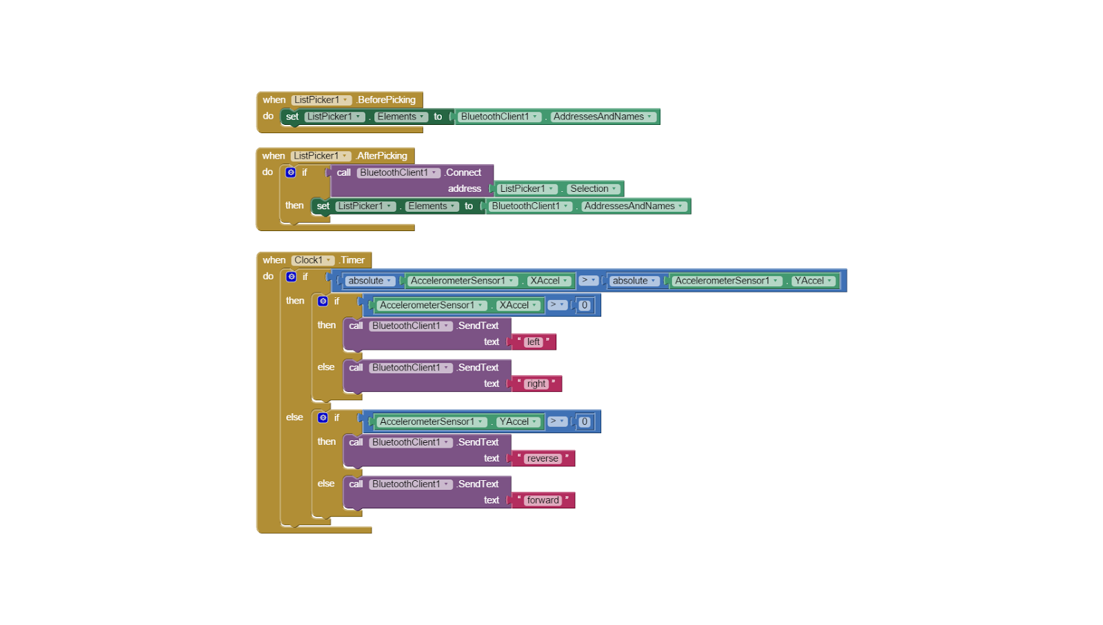 I wrote a code in App inventor 2 for controling this car with bluetooth, but I did not find the way to do it with the android acceleretor.